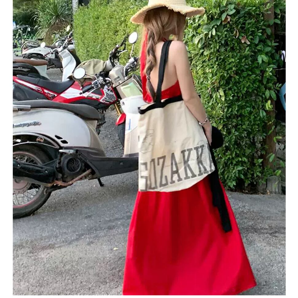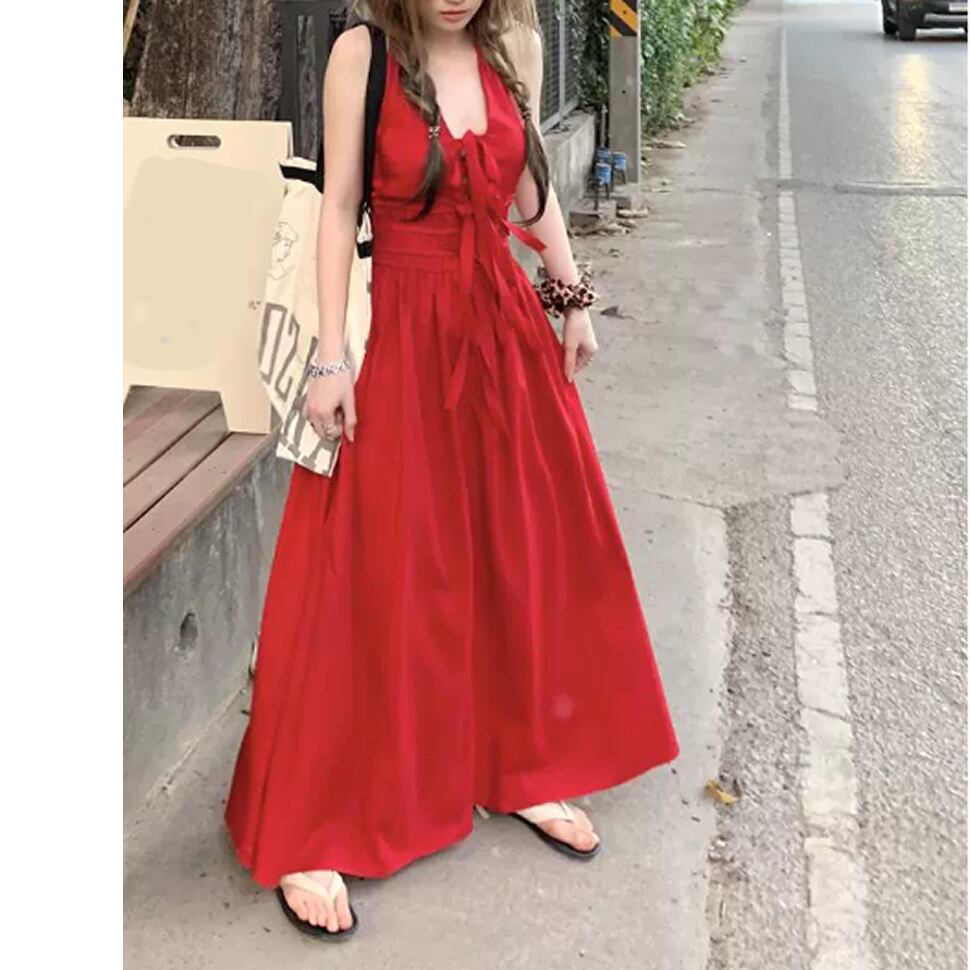 レディース ホルターネック Vネック ワンピース ロング丈 レッド AS13179