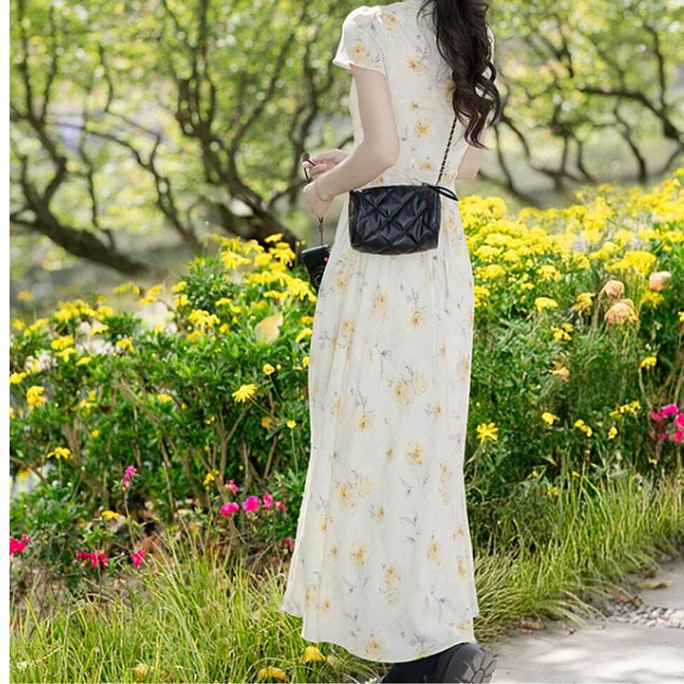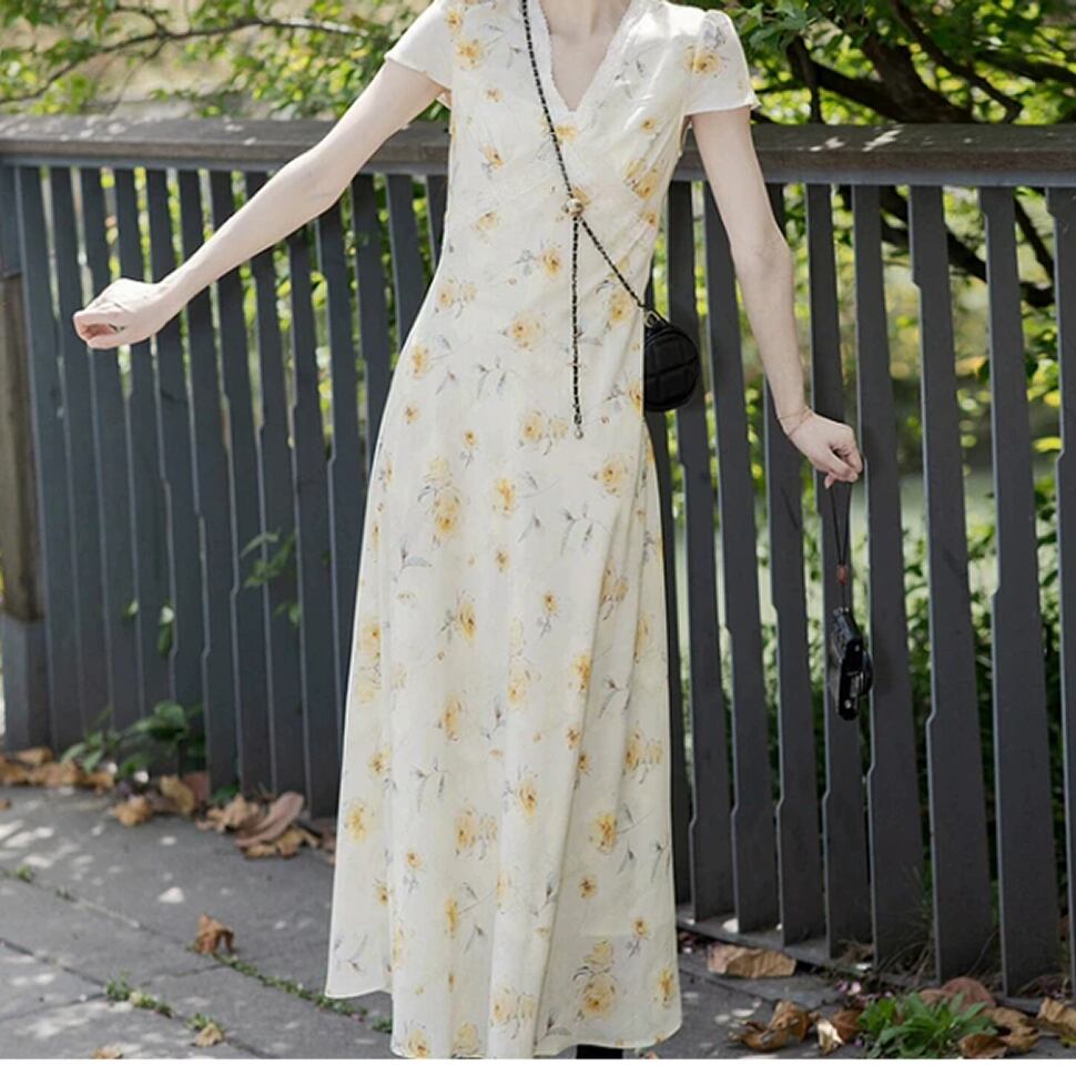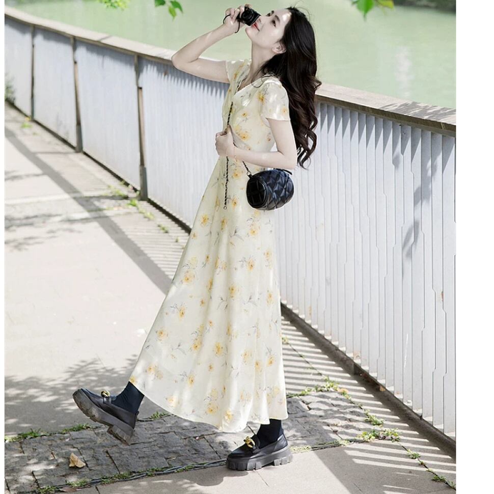 レディース 花柄 半袖 ワンピース ロング丈 イエロー AS13186