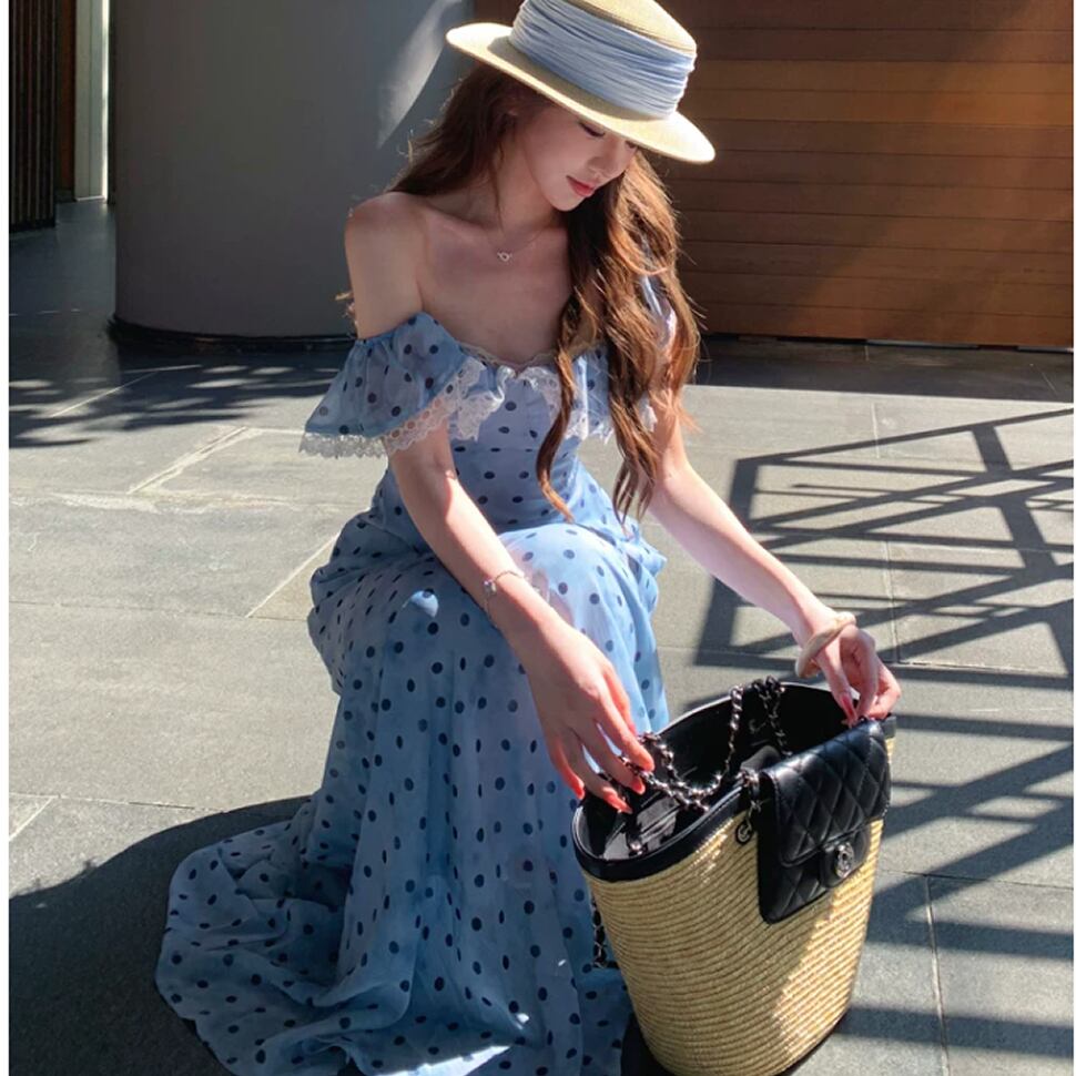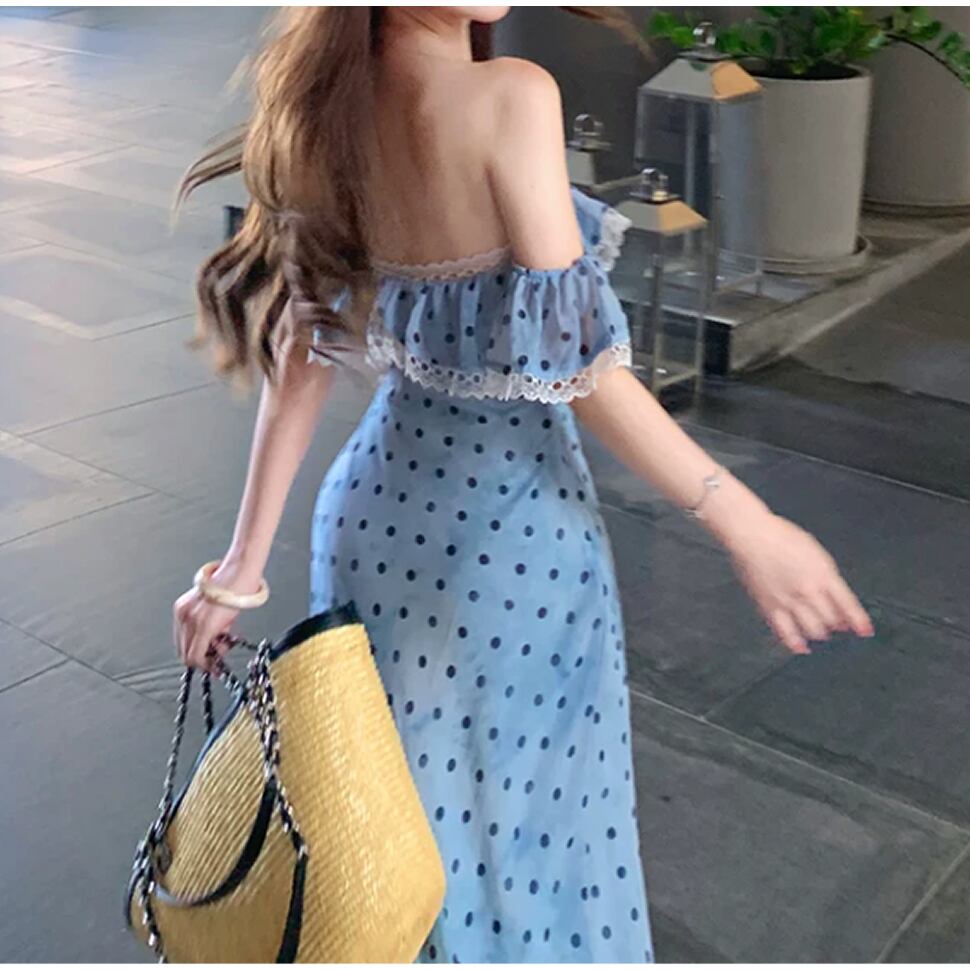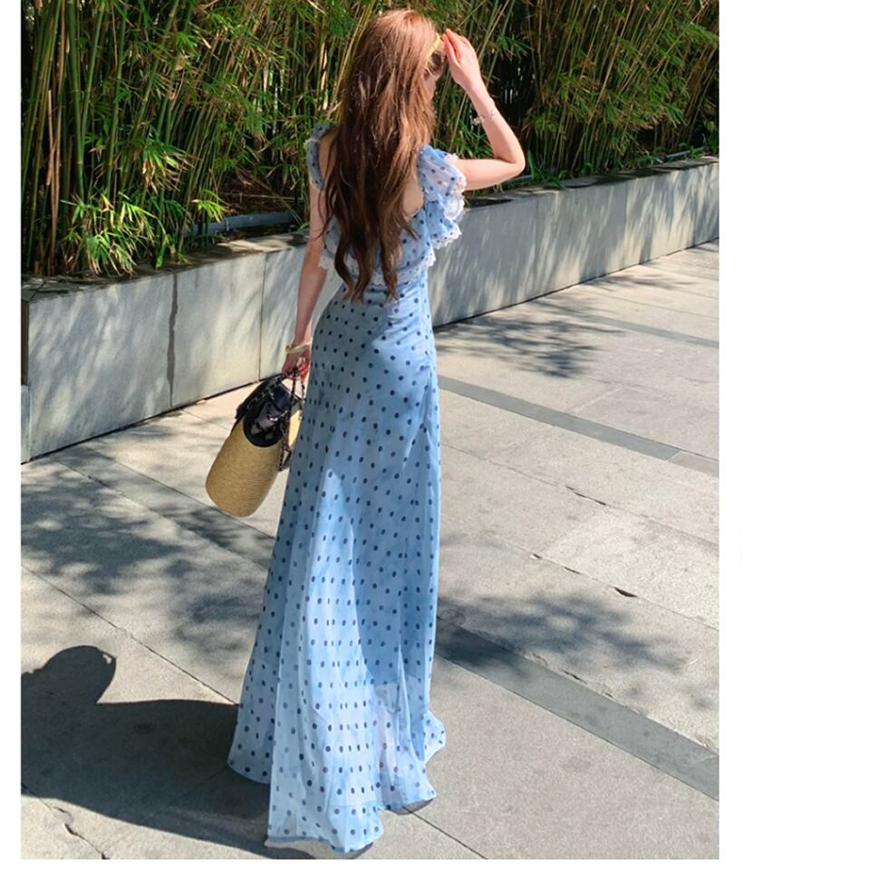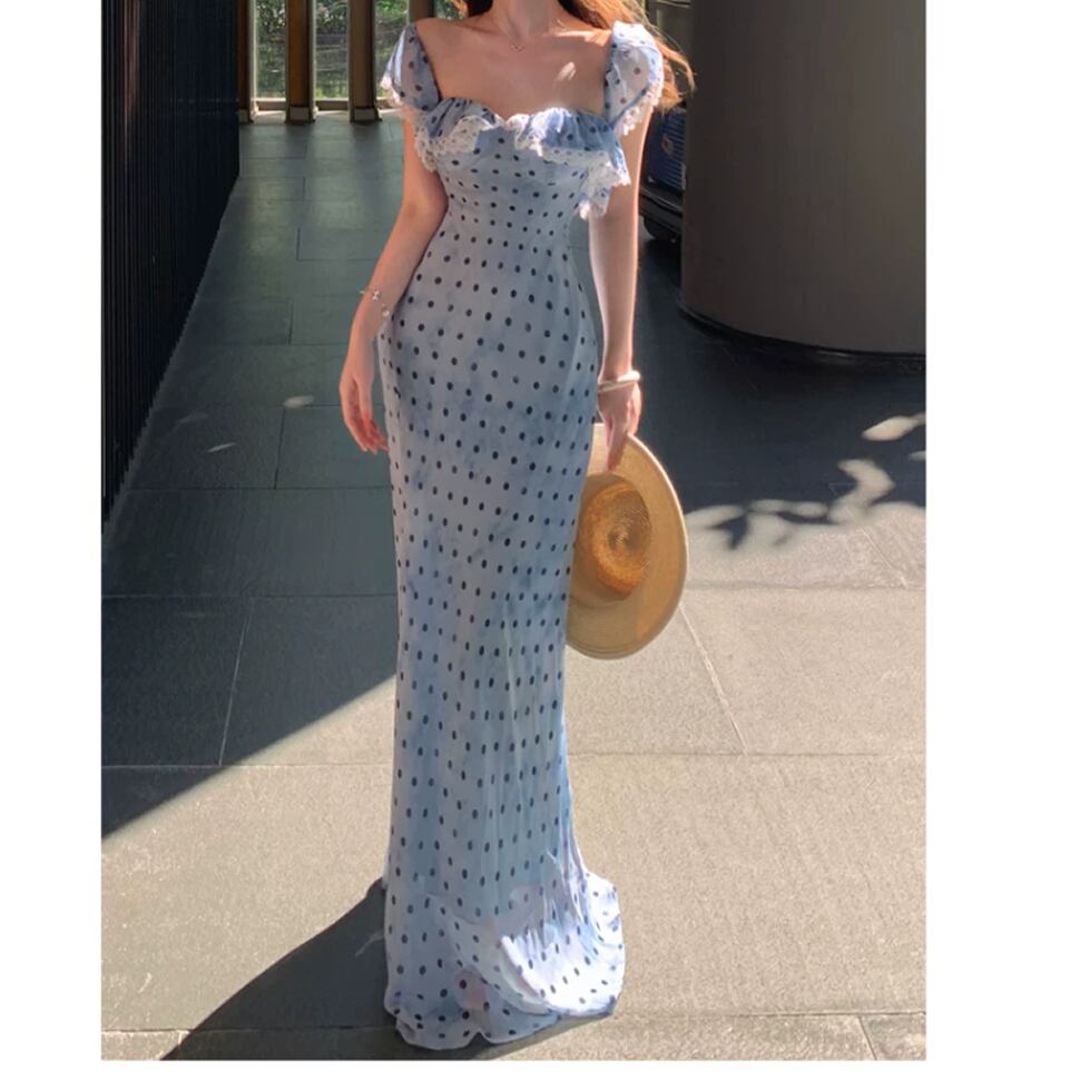 レディース ドット柄 ノースリーブ ワンピース ロング丈 ブルー AS13191