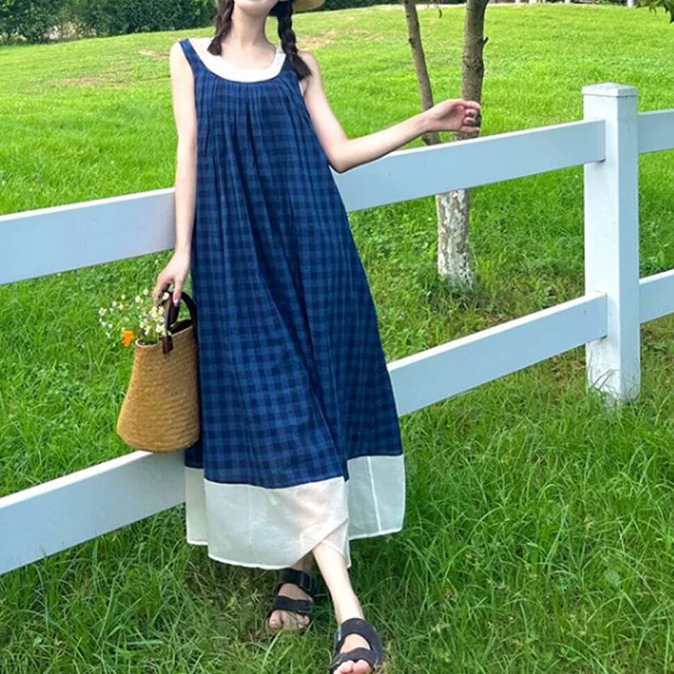 レディース チェック柄 ノースリーブ ワンピース ロング丈 AS13194
