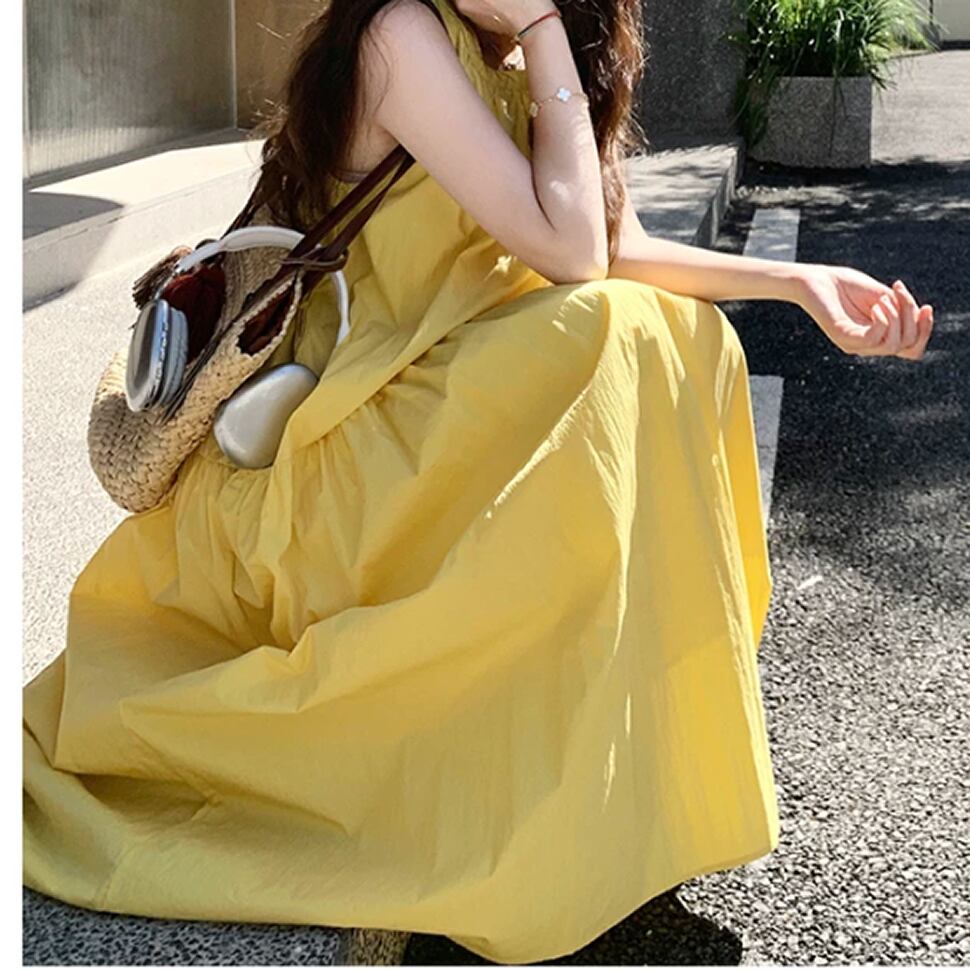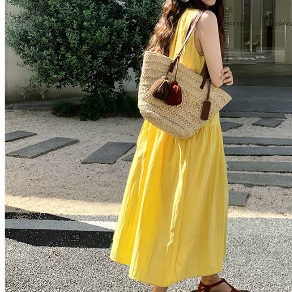 レディース 無地 ノースリーブ ワンピース ロング丈 イエロー AS13195