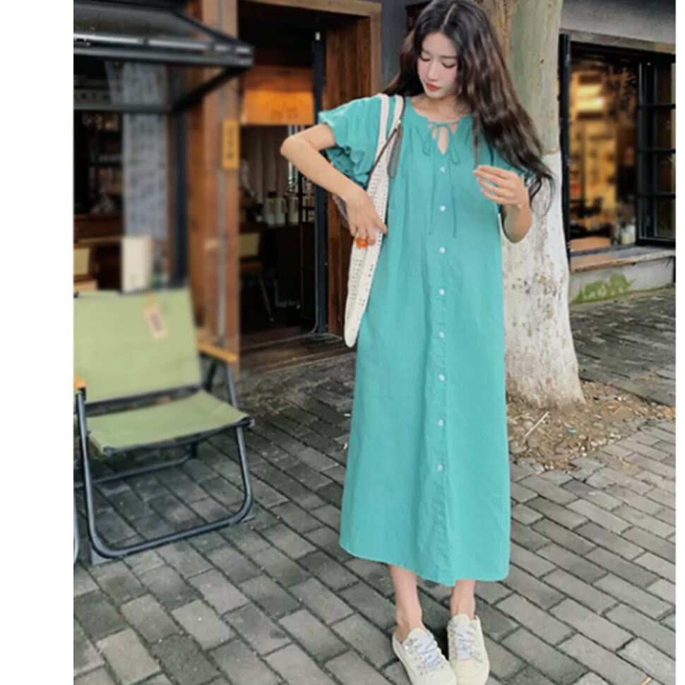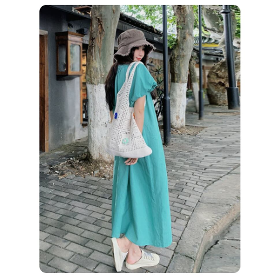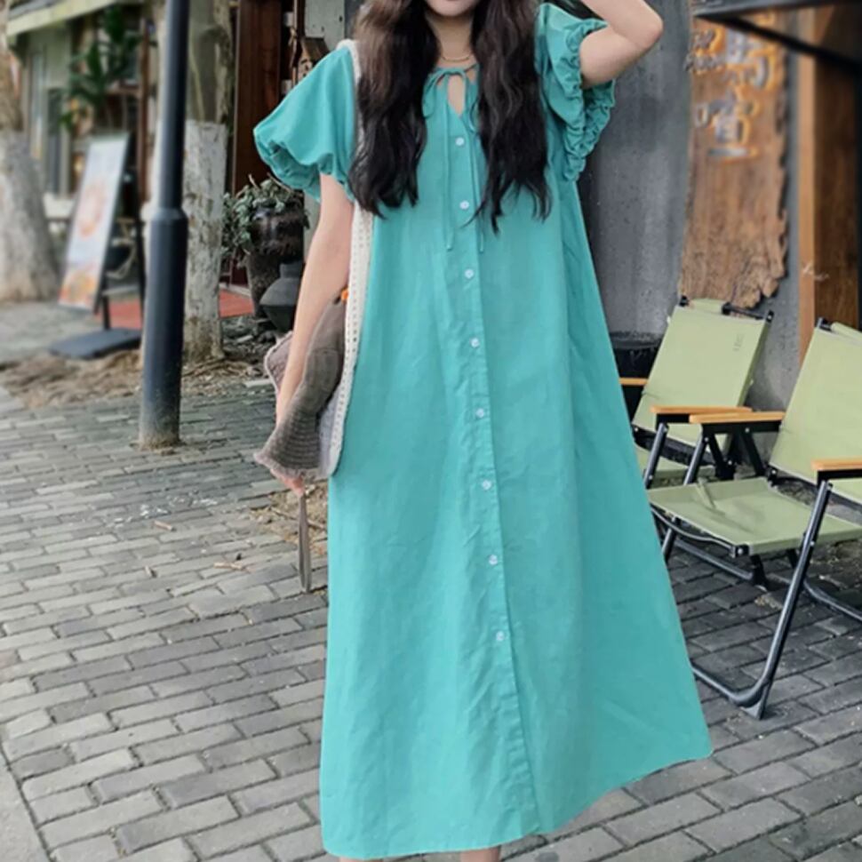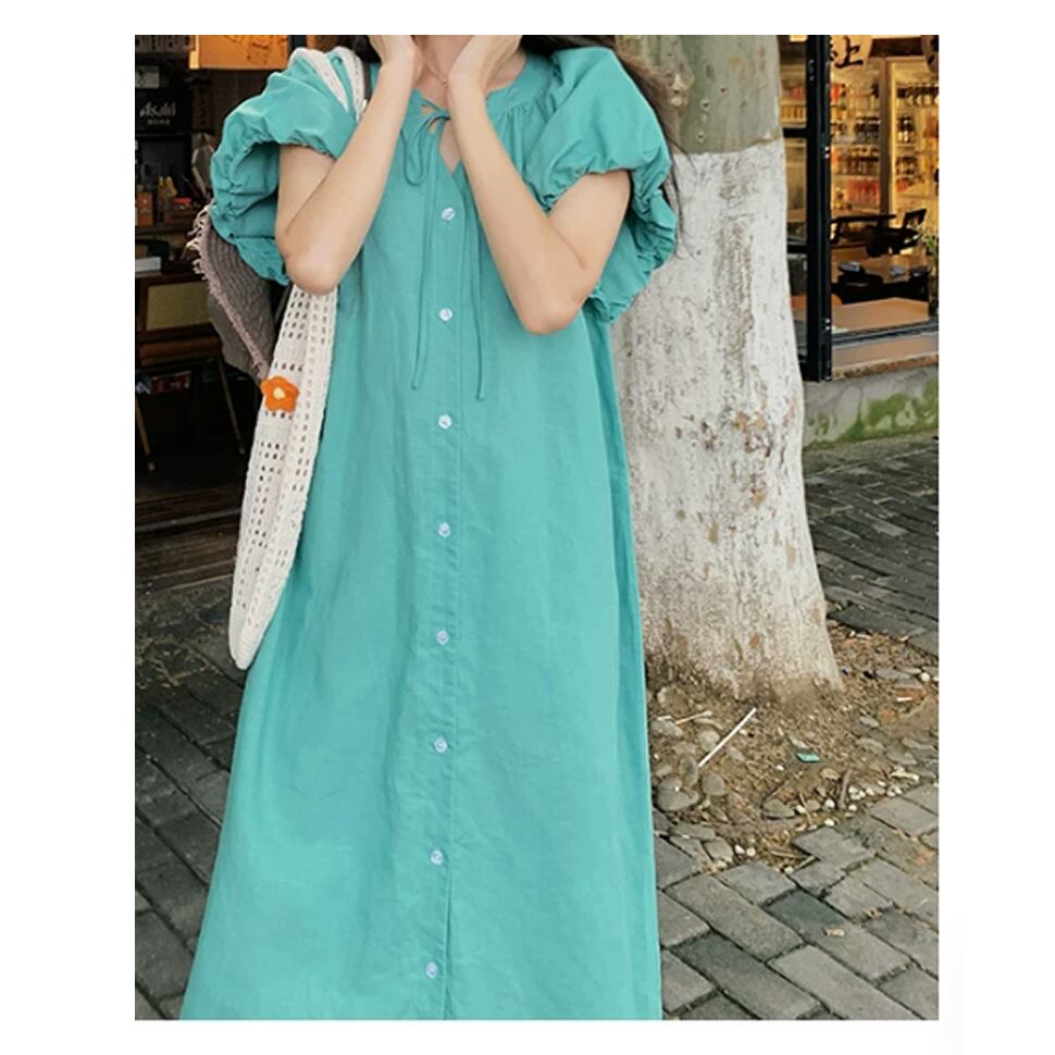 レディース 半袖 ワンピース ロング丈 パフスリーブ グリーン AS13197