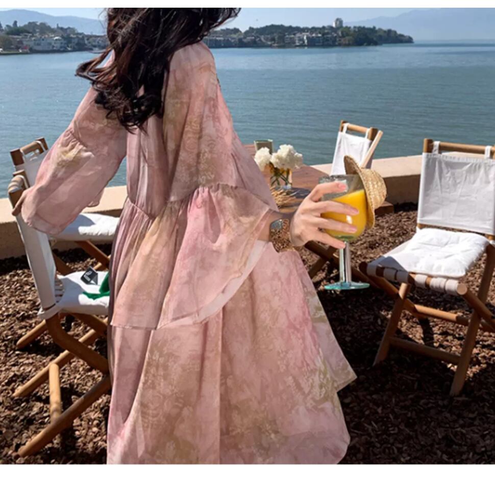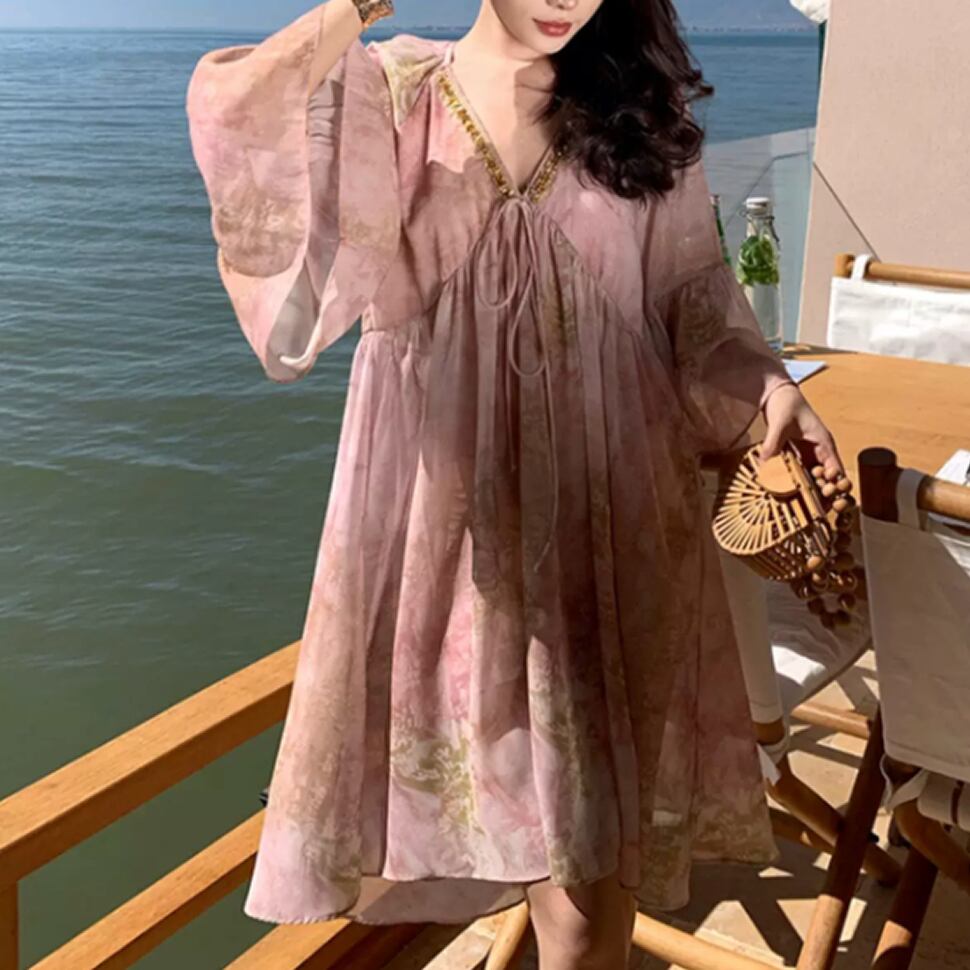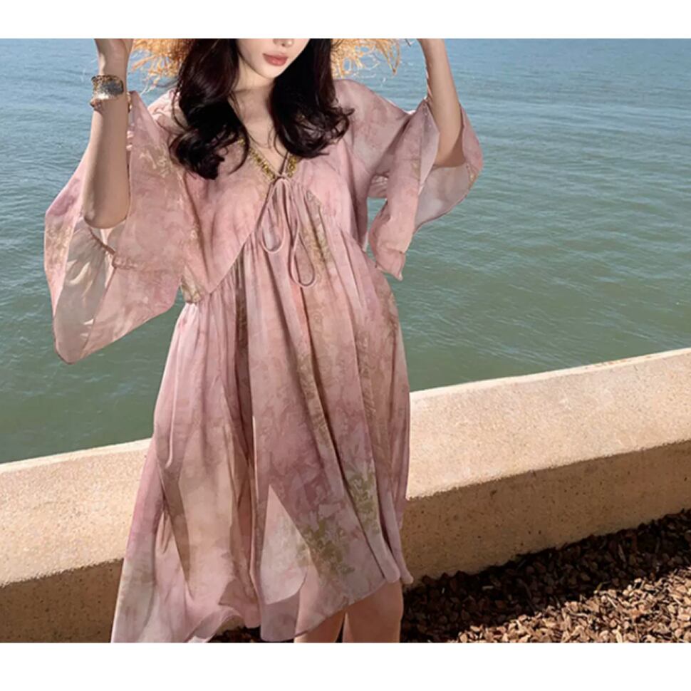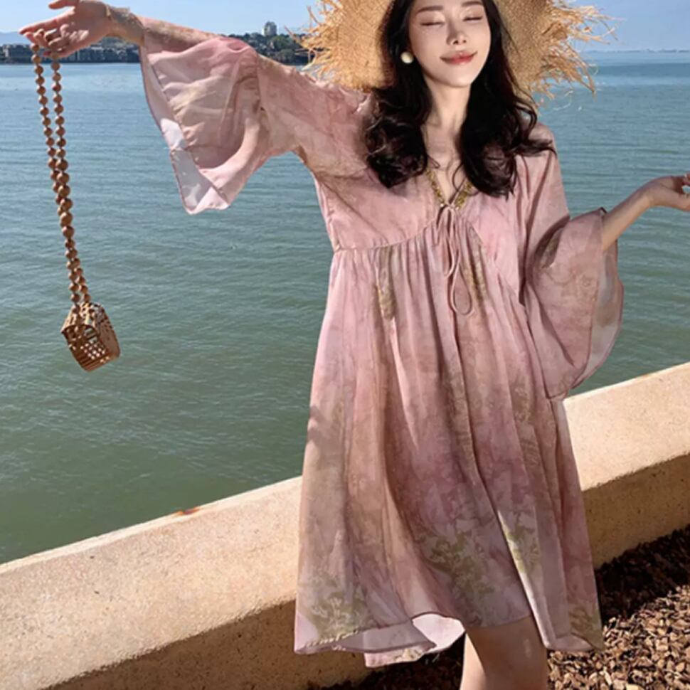 レディース 花柄 Vネック 長袖 ワンピース ミニ丈 AS13200