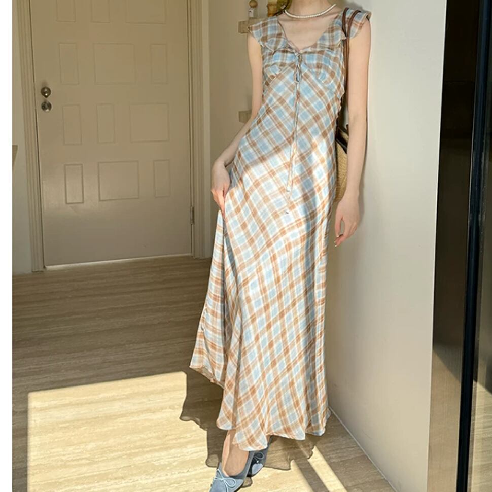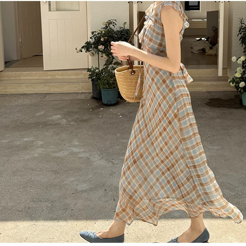 レディース チェック柄 半袖 ワンピース ロング丈 AS13201
