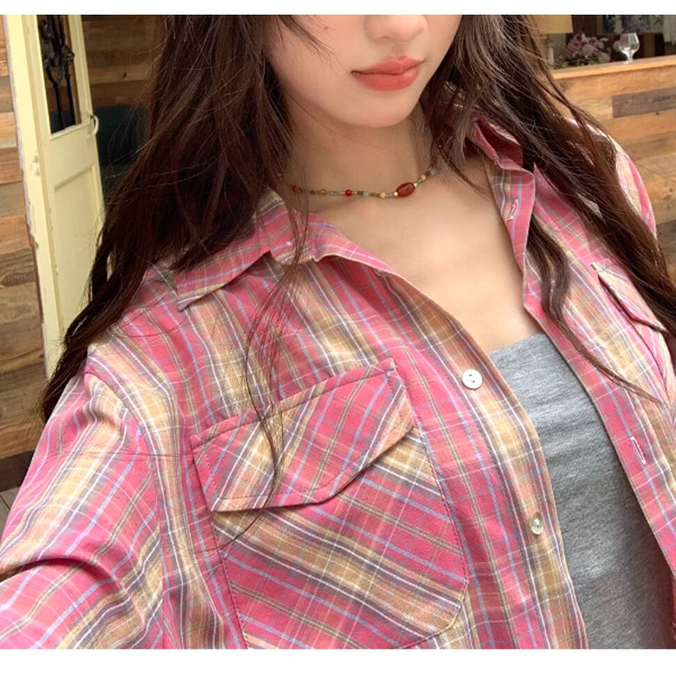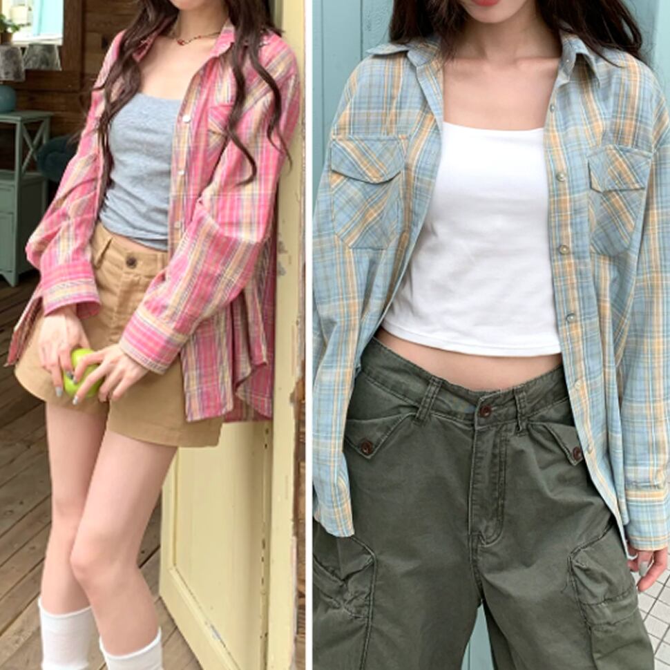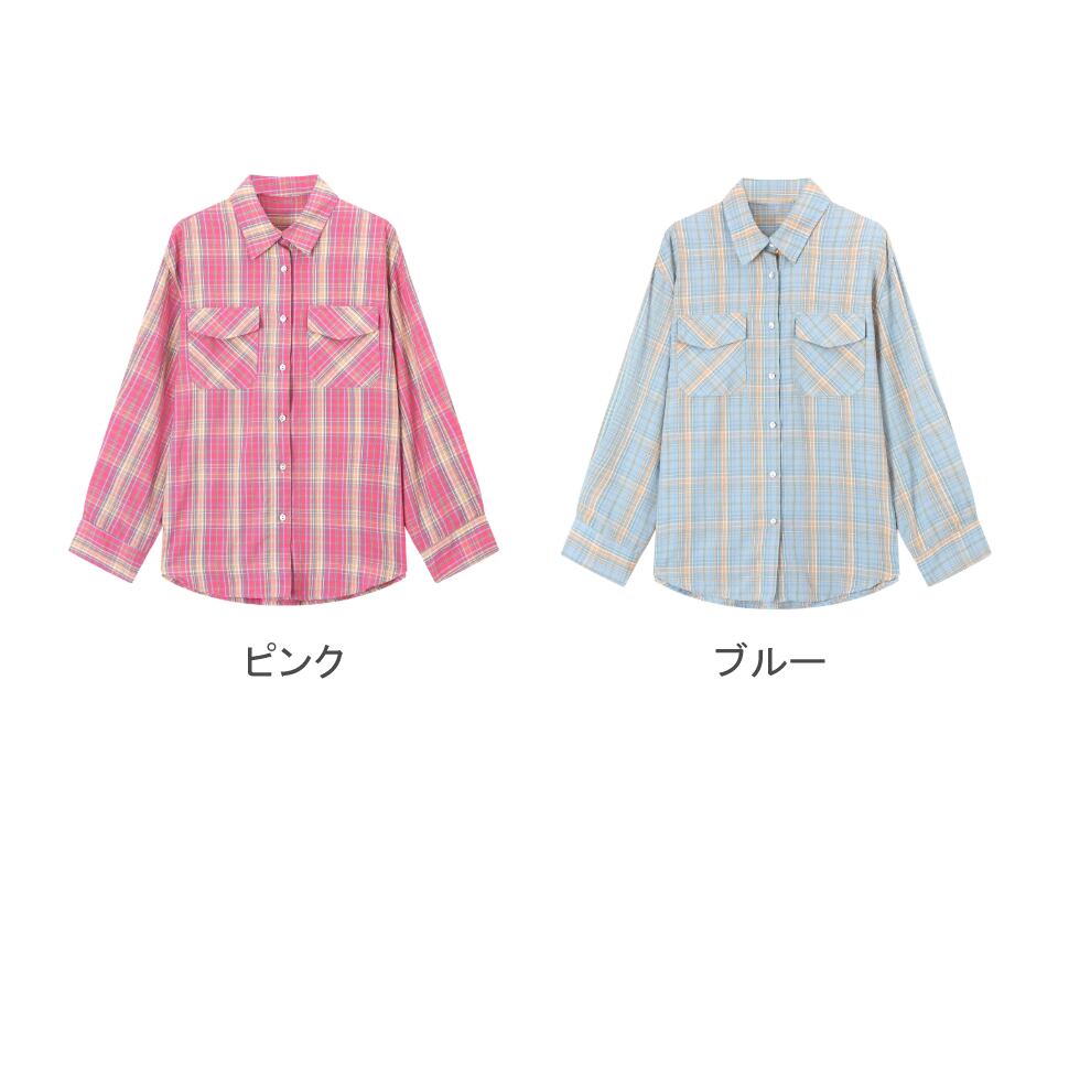 レディース チェック柄 長袖 トップス シャツ ロング丈 ピンク ブルー AS13209