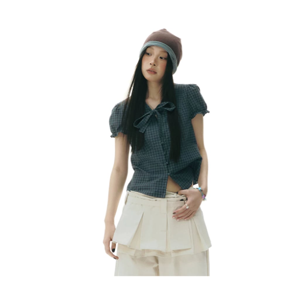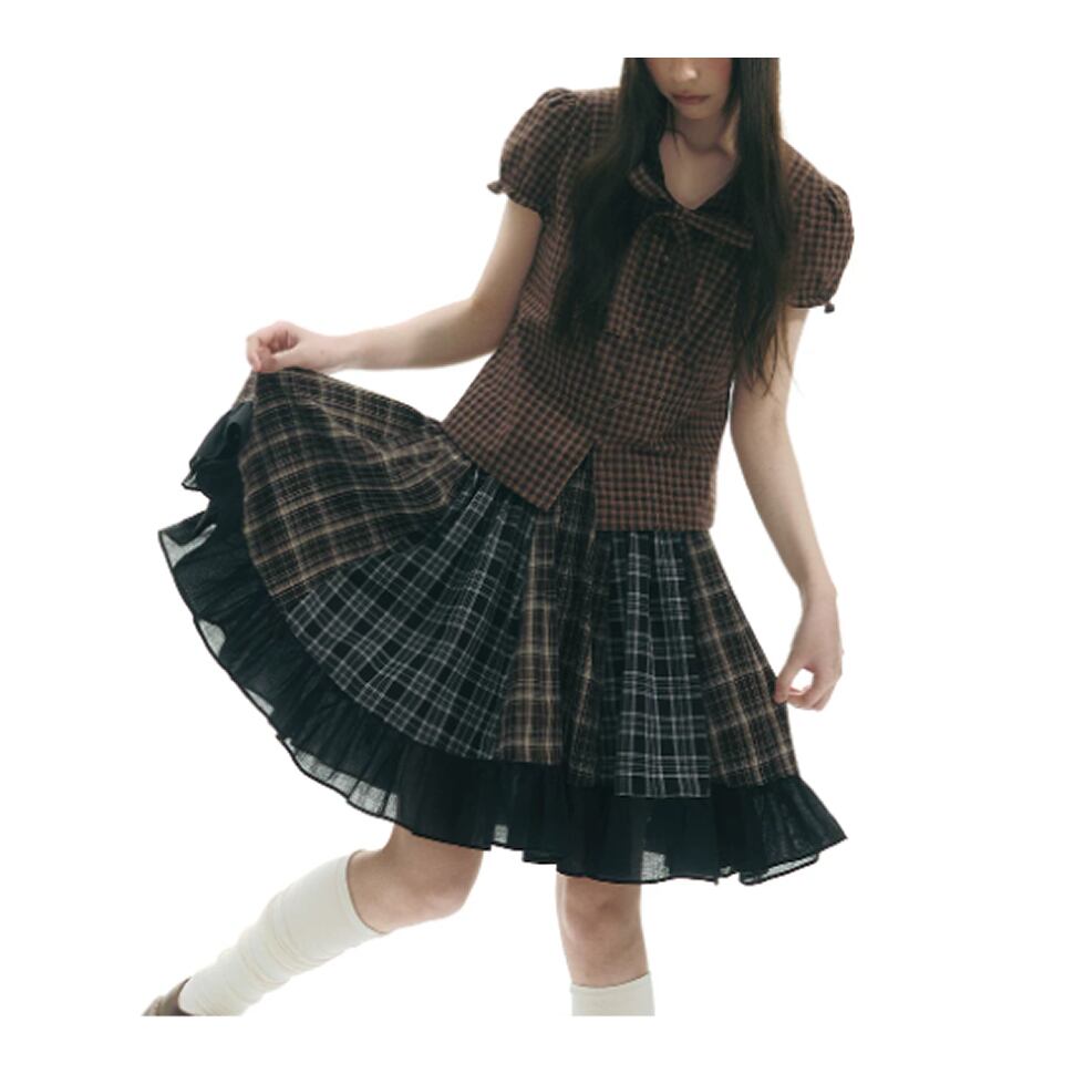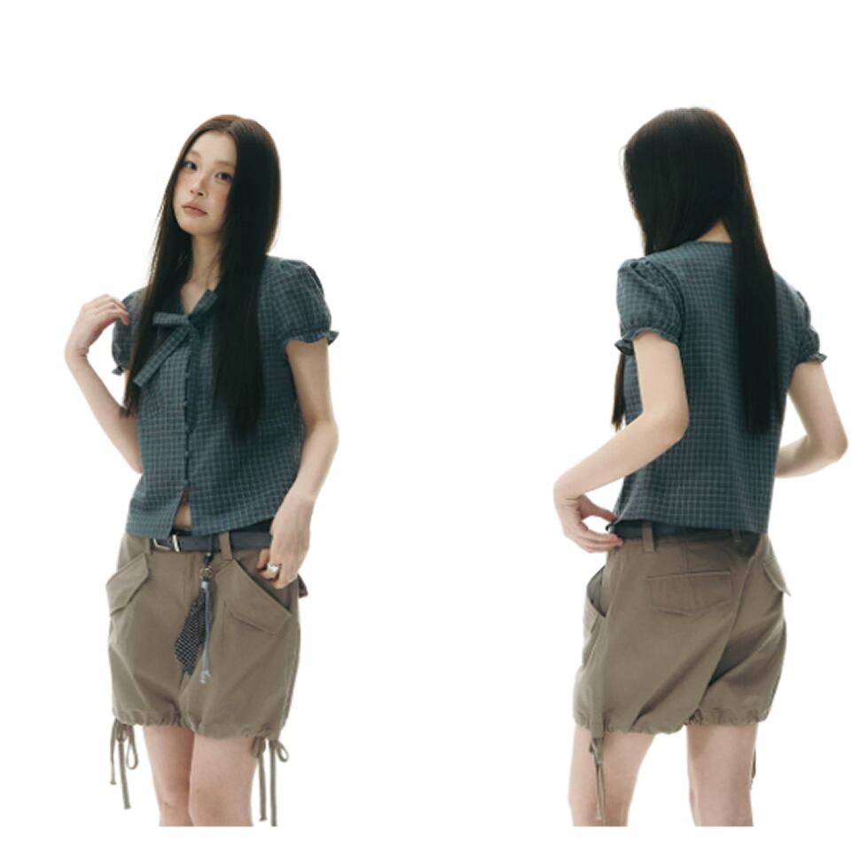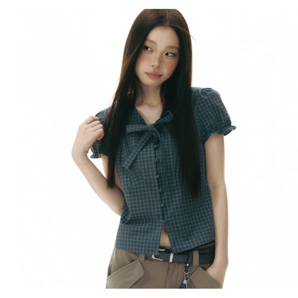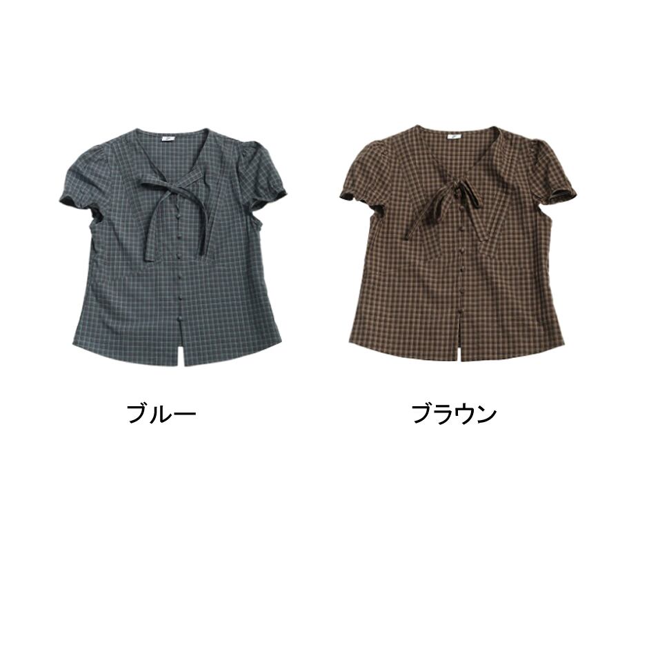 レディース チェック柄 半袖 トップス シャツ ブラウン ブルー フロントリボン AS13218