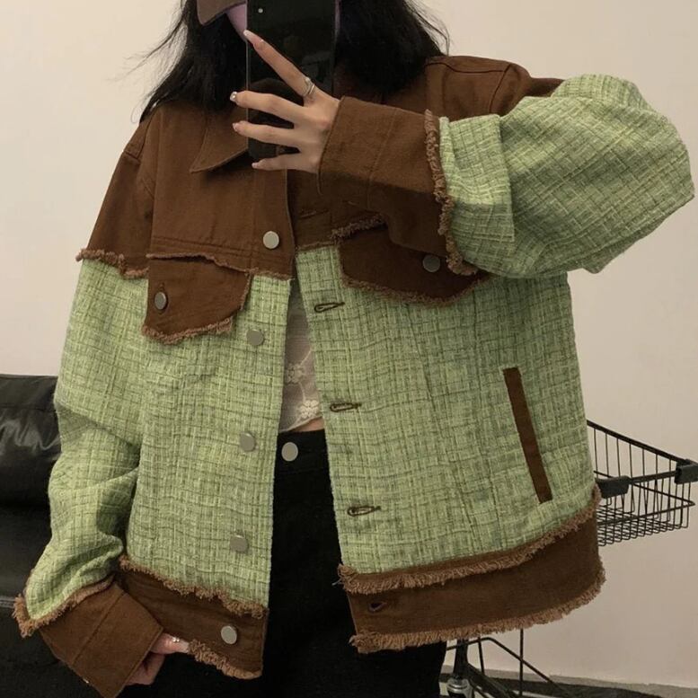 アウター ジャケット ショート 長袖 襟付き デニム ツイード ステッチ カジュアル おしゃれ かっこいい ガーリー 個性的 存在感 秋 冬 レディース 暖かい グリーン AS10003