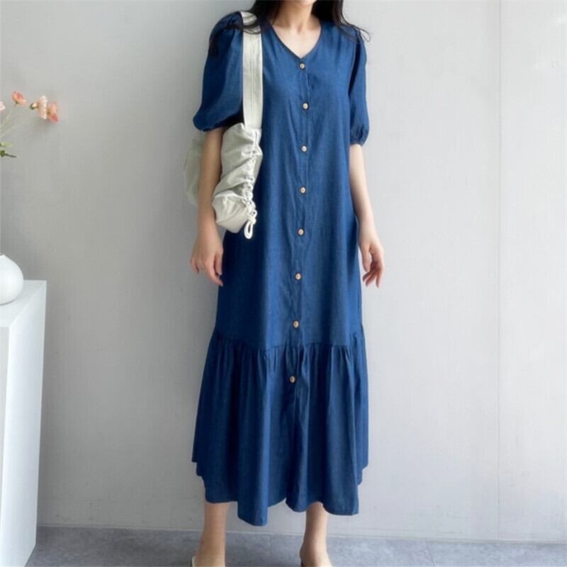フリルワンピース ワンピース デニムスカート フレアワンピース デニムワンピース ロング丈 半袖 パフスリーブ Vネック 襟なし フレア ワイド Aライン フリル デニム かわいい きれいめ シンプル カジュアル おしゃれ レトロ 大人可愛い こなれ感 ラフ ルーズ 無地 夏 10代 20代 30代 レディース ママ 通勤 学生 通学 デート お出かけ 公園デビュー 女子会 休日 着回し 普段使い 韓国 楽ちん モテ 体系カバー サイズ S M L XL ゆったり サイズ 色展開 ライトブルー 濃紺