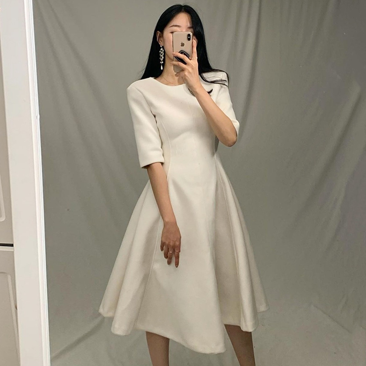 シンプルなデザインのワンピースドレス。