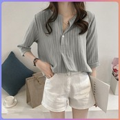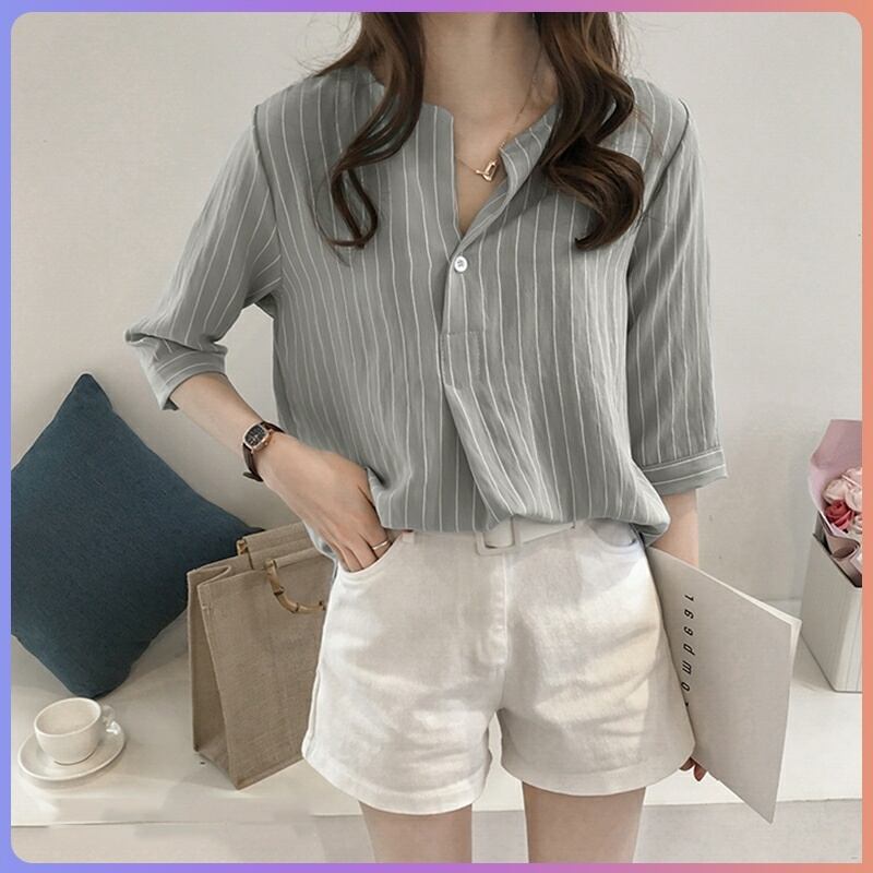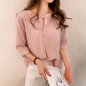 ストライプシャツ 大きいサイズ 小さいサイズ トップス シャツ ブラウス 袖あり 5分袖 五分袖 Vネック 襟なし かわいい 大人可愛い きれいめ シンプル 大人 上品 おしゃれ お洒落 清楚 大人女子 抜け感 ナチュラル 知的 爽やか スマート 柄 ストライプ 春 夏 秋 ロングシーズン 10代 20代 30代 40代 ビジネス OL 通勤 お出かけ 女子会 休日 お茶会 ランチ オフィス ショッピング 着回し 二の腕カバー M L XL 2XL 3XL 4XL グレー ピンク ネイビー ホワイト