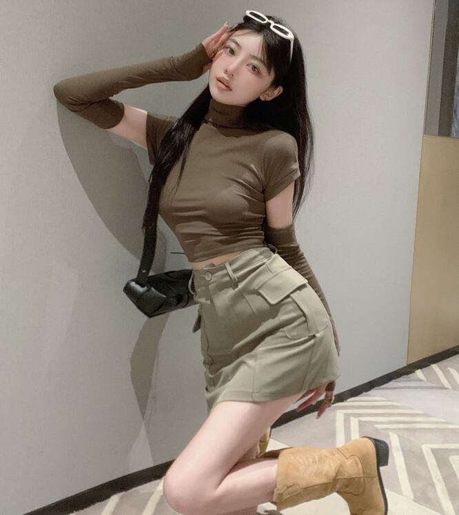 アームウォーマー付き バックドローストリング トップス カットソー ショート丈 細身 きれいめ 大人 お洒落 個性的 セクシー 主役級 無地 デート お出かけ 韓国系 ブラック ブラウン グレー AS10016