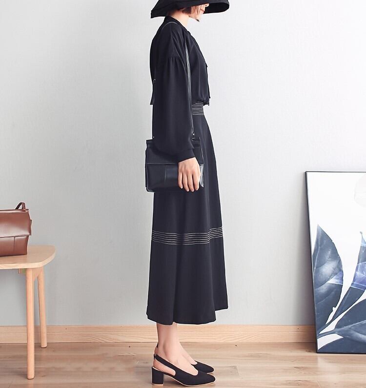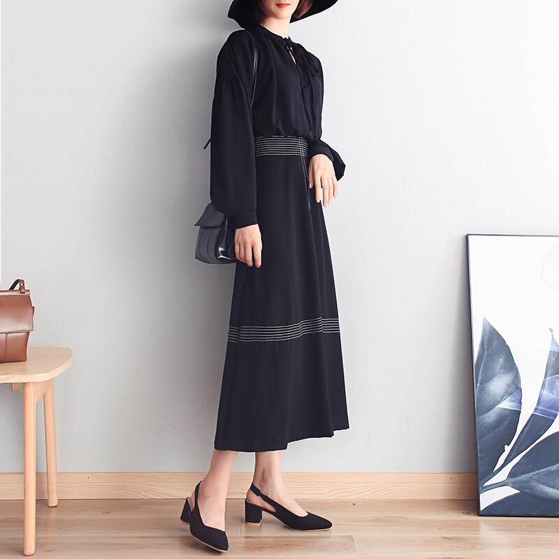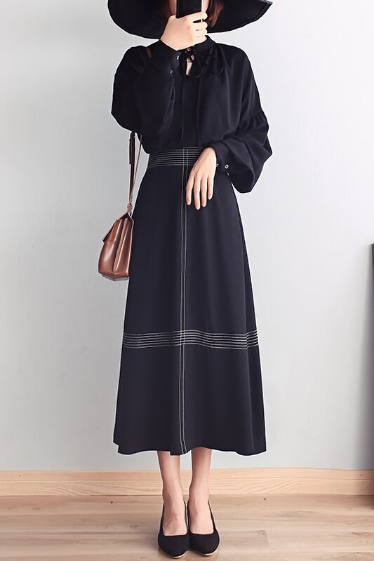 ブラックドレス スカート ワンピース ロングスカート ワンピドレス ロング ロング丈 長袖 ラウンドネック 襟なし Aライン 切り替えデザイン リボン ウエストマーク ハイウエスト ポリエステル かわいい 大人可愛い きれいめ シンプル 大人 上品 おしゃれ かっこいい 大人女子 クール モード系 セクシー エレガント モダン フォーマル 無地 春 秋 ビジネス OL 通勤 デート お出かけ 女子会 パーティー イベント ホテル ガーデン レストラン 韓国系 モテ サイズ XS S M L 色展開 黒