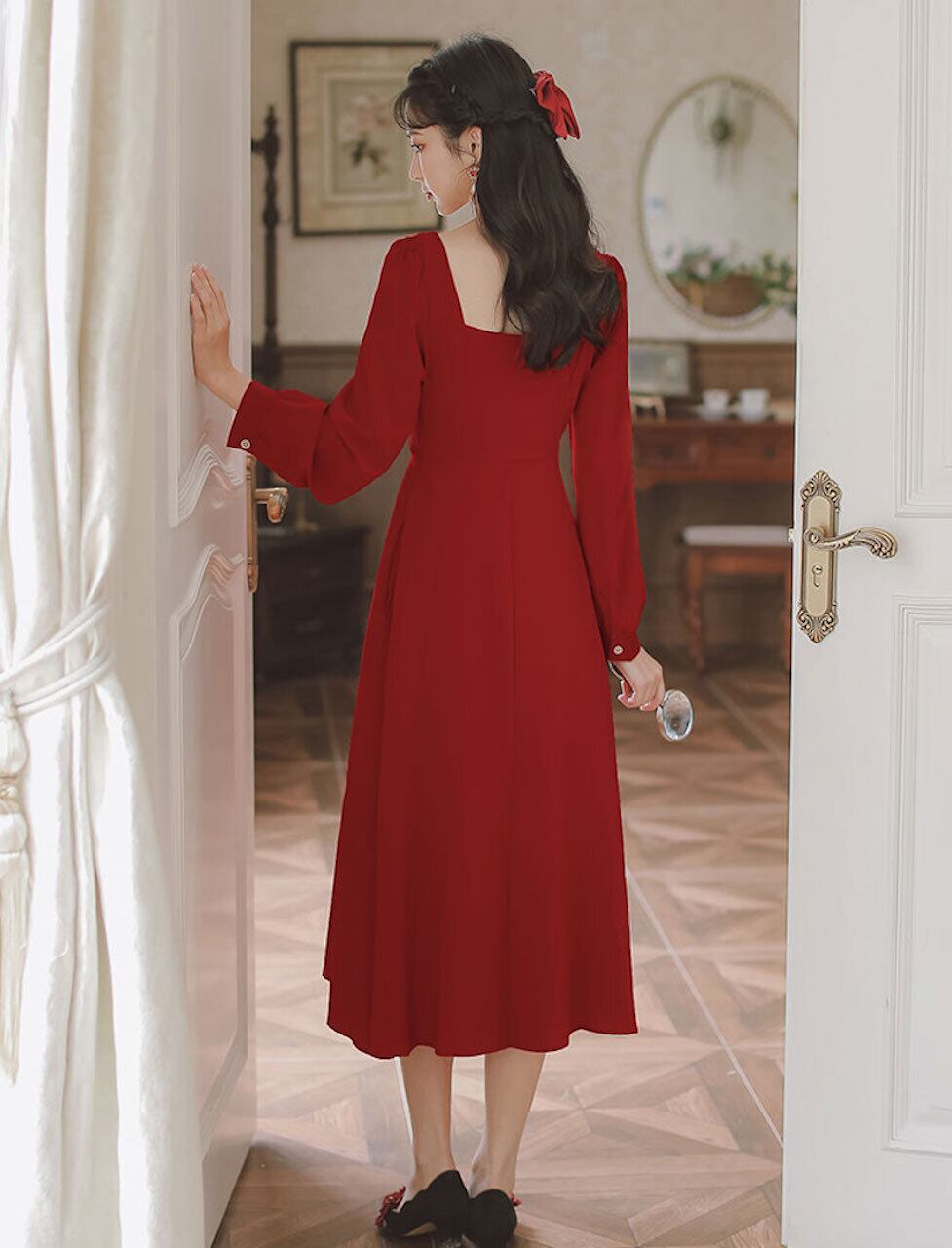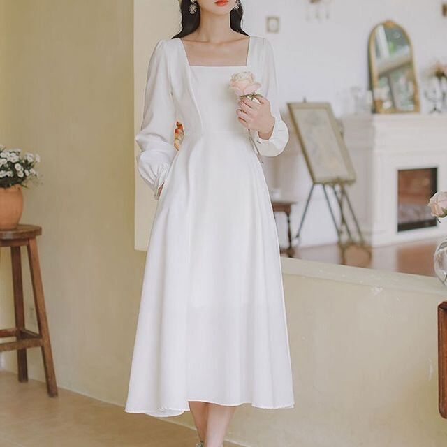 ワンピース ロングスカート ロング ロング丈 袖あり 長袖 スクエアネック Aライン スマート ハイウエスト 綿 かわいい 大人可愛い きれいめ シンプル 大人 上品 おしゃれ お洒落 アジアン 大人可愛い 大人女子 キュート モード系 無地 春 秋 冬 誕生日 結婚式 二次会 披露宴 ハロウィン クリスマス バレンタイン 10代 20代 30代 レディース 女性用 デート 女子会 旅行 ホテル 韓国系 ファッション 美脚 プレゼント 流行 インスタ映え