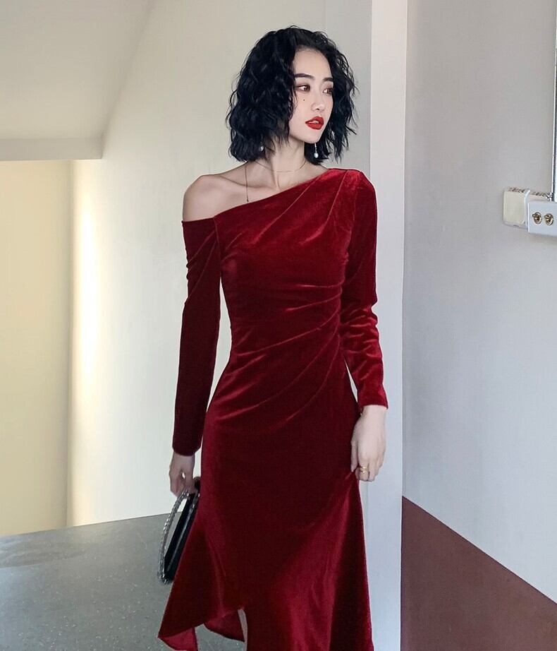 ドレス パーティードレス カラードレス イブニングドレス 膝丈 ひざ丈 袖あり 長袖 ワンショルダー スレンダーライン タイト スリム 細身 華奢 華奢魅せ ベルベット 大人 上品 かっこいい クール セクシー エレガント 主役級 フォーマル ゴージャス 華やか 大人 存在感 クラシック 個性的 無地 20代 30代 40代 レディース 女性用 パーティー イベント ホテル ファッション スタイル 二の腕カバー 美脚 高見え 格上げ インスタ映え 秋 冬 お呼ばれ パーティー 赤 レッド ワインレッド