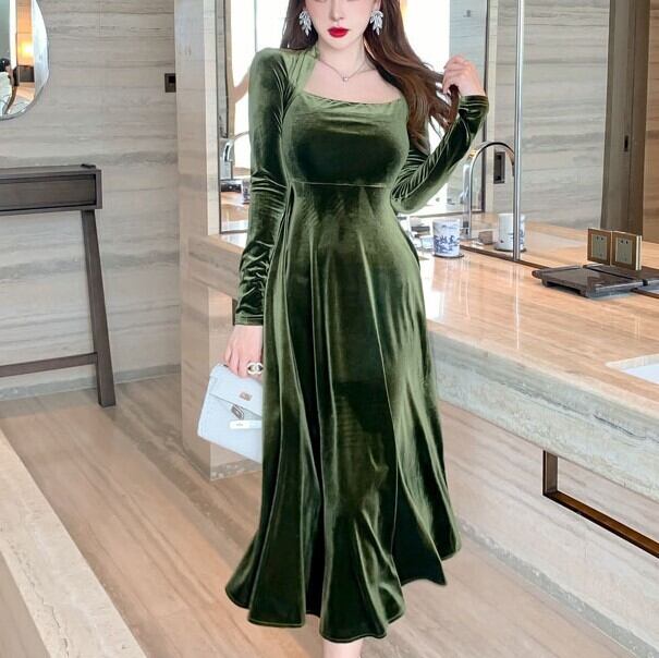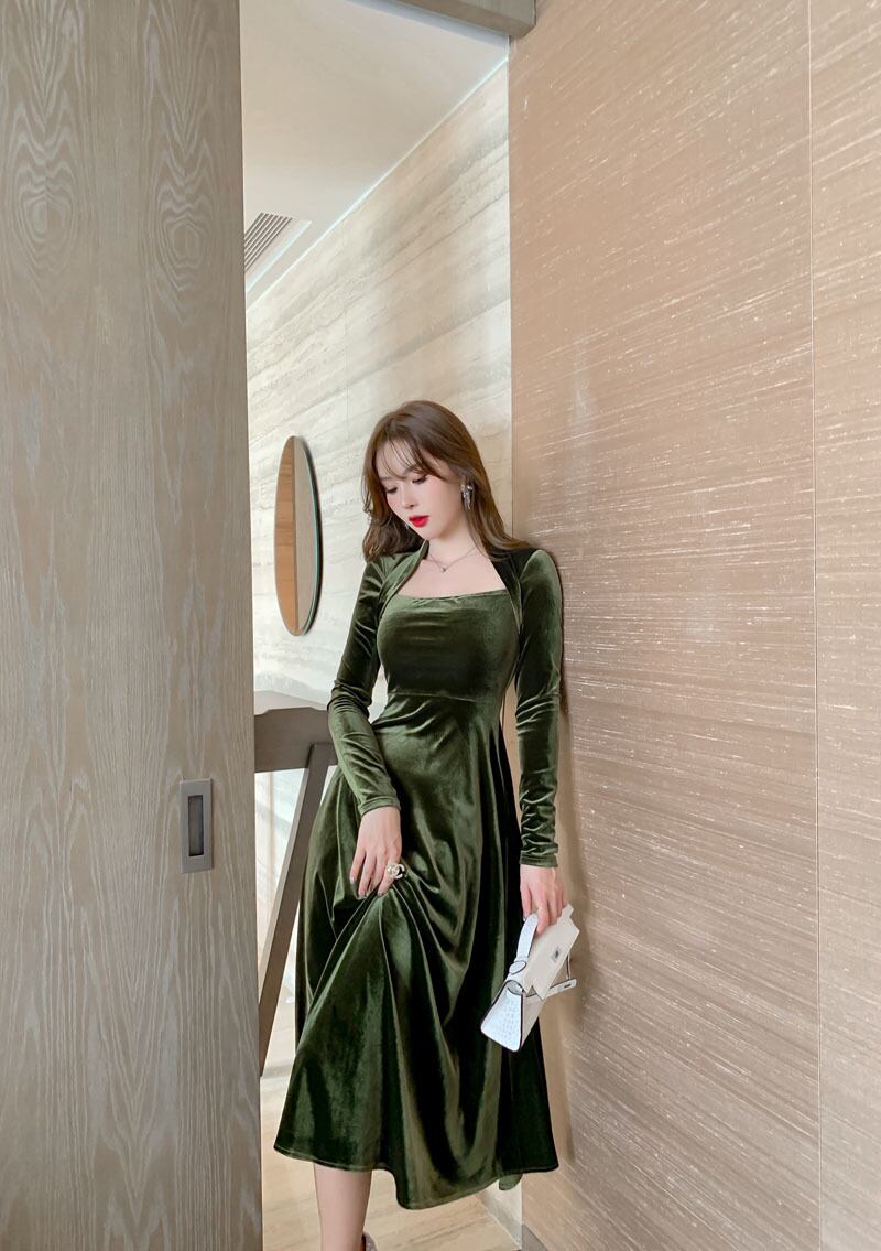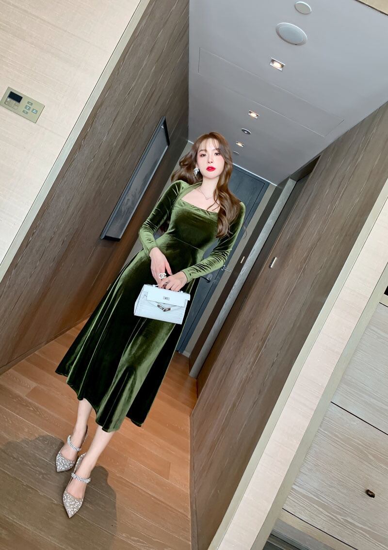 ドレス ヨーロッパ風 イブニングドレス 膝下 ミモレ ミモレ丈 7分丈 袖あり 長袖 スクエアネック Aライン スレンダー 胸元 華奢 華奢魅せ ベルベット ベルベット生地 かわいい 大人可愛い きれいめ シンプル 大人 上品 おしゃれ お洒落 大人女子 個性的 クール モード系 セクシー エレガント フォーマル 主役級 クラシック 無地 20代 30代 レディース 女性用 パーティー イベント ファッション コーデ スタイル 秋 冬 お呼ばれ パーティー パーティ S M L 緑 グリーン