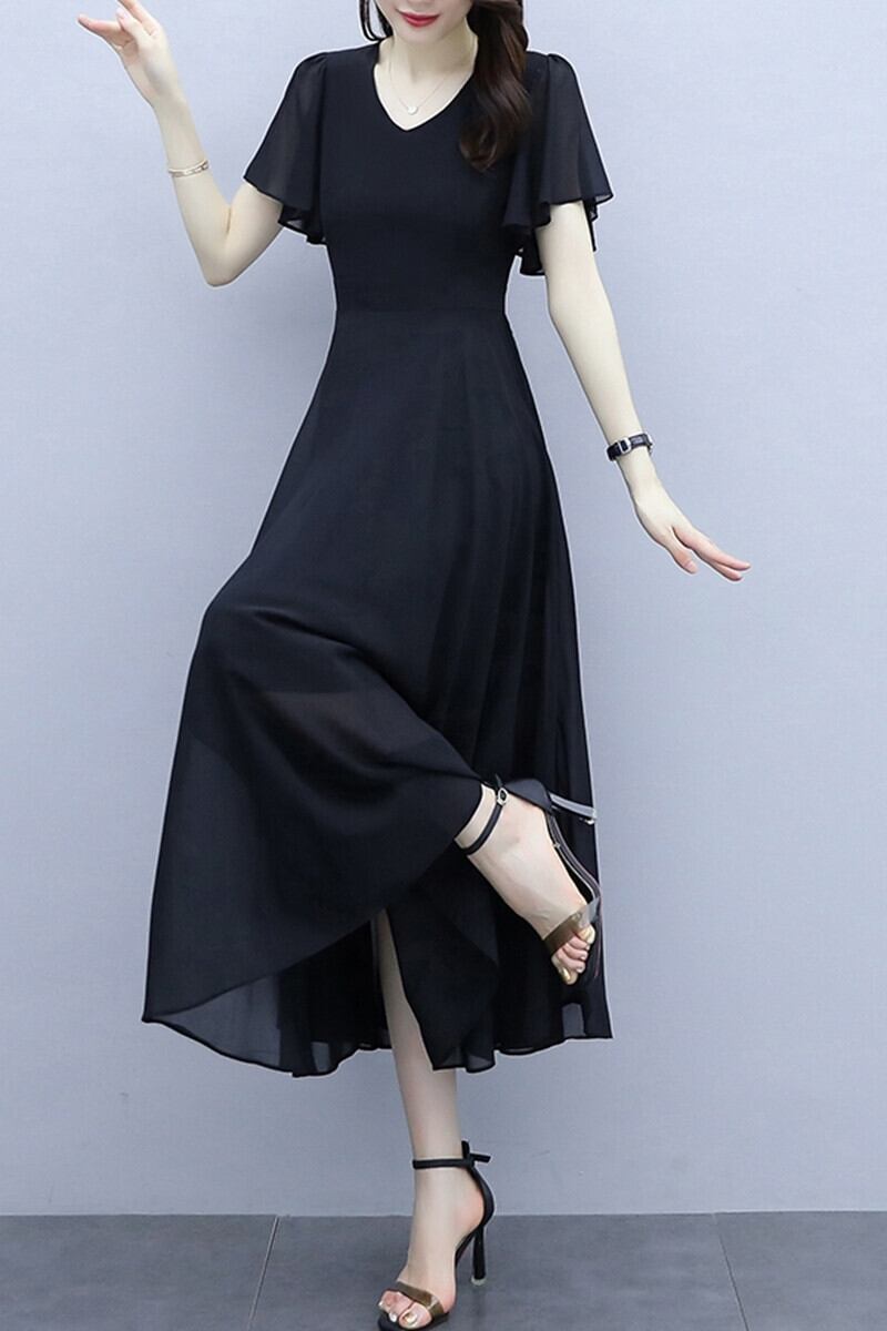シフォン ドレス ワンピース パーティードレス 結婚式ドレス 二次会ドレス ロングドレス フォーマルドレス ブラックドレス ロング丈 半袖 フレアスリーブ Vネック Aライン フレア シフォン 大人可愛い きれいめ シンプル 上品 大人女子 フォーマル クラシック 清楚 モダン 無地 20代 30代 40代 レディース パーティー ホテル 脚長 夏 結婚式 二次会 2次会 1.5次会 披露宴 お呼ばれ パーティー 謝恩会 サイズ M L XL 2XL 3XL 4XL 5XL 色展開 ブラック レッド