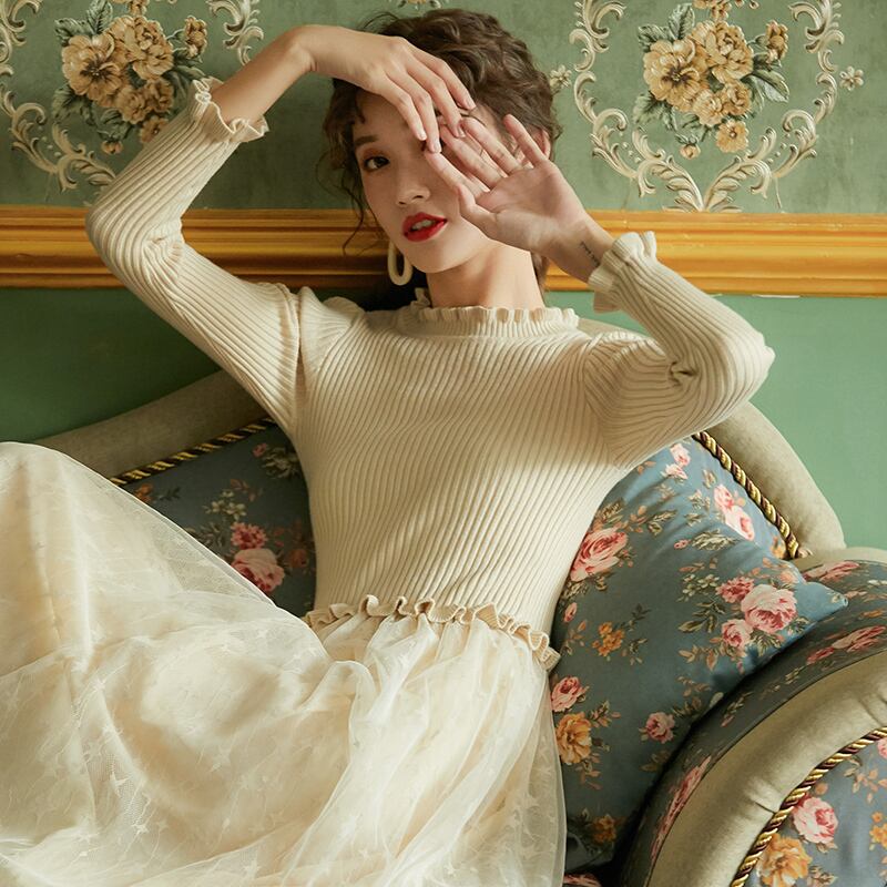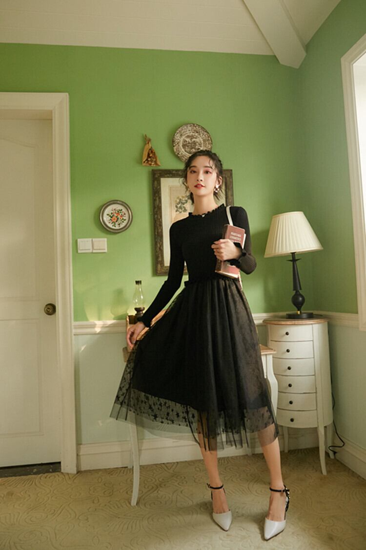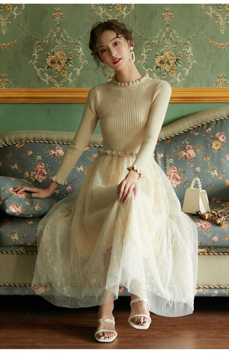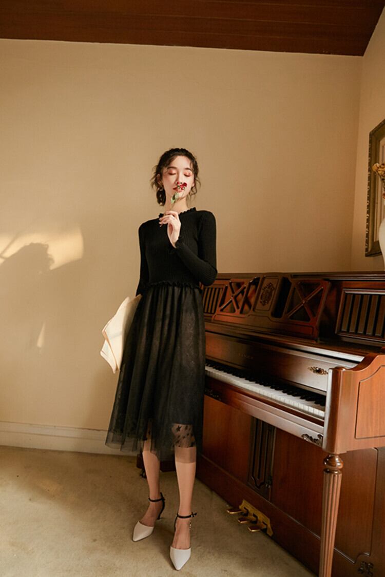 スカート ワンピース チュールスカート ニットドレス 膝下 ミモレ ミモレ丈 7分丈 袖あり 7分袖 ハイネック タートルネック セミフレア ドッキング スマート 着やせ チュール リブニット 伸縮性 ニット かわいい きれいめ 上品 おしゃれ お洒落 メンズライク ラブリー キュート ガーリー 個性的 エレガント モダン フェアリー 無地 秋 冬 普段使い 重ね着 ファッション コーデ スタイル 楽ちん 体系カバー トレンド S M L XL 2XL 3XL 白 ホワイト 黒 ブラック オフホワイト
