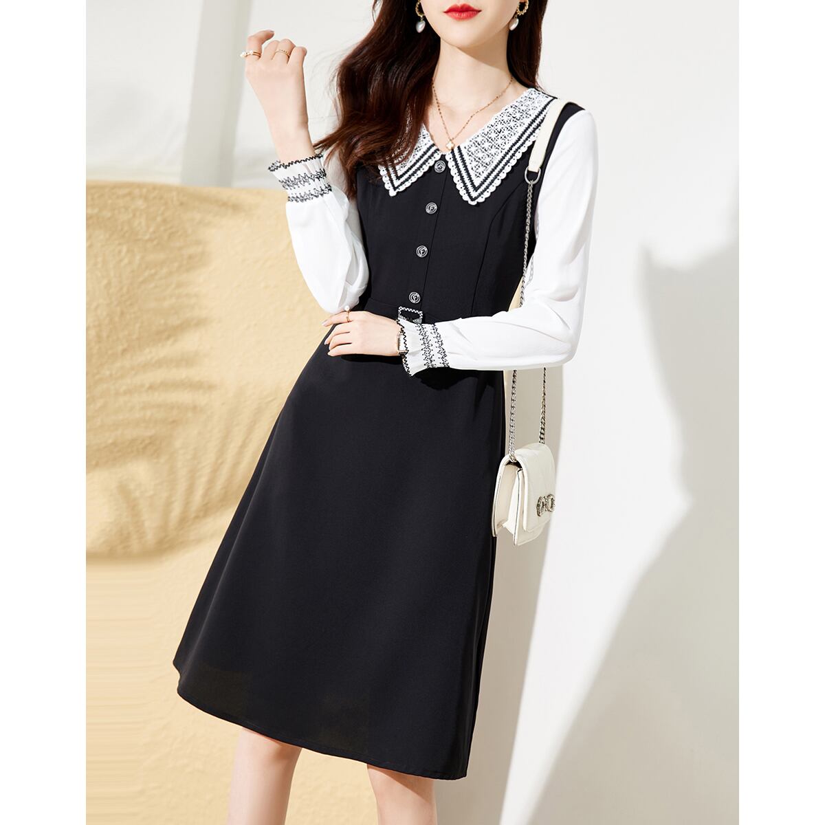 ワンピース 膝丈 ひざ丈 膝下 袖あり 5分袖 五分袖 Vネック 襟付き セミフレア スリム 細身 ストレート Aライン スマート 着やせ レース 刺繍 ベルト ウエストマーク ハイウエスト かわいい きれいめ 上品 おしゃれ お洒落 レトロ エスニック ラブリー キュート ガーリー 個性的 カレッジスタイル 無地 柄 秋 10代 20代 レディース 普段使い 韓国 ファッション コーデ スタイル 楽ちん 美脚 脚長 S M L XL 2XL 大きいサイズ 白 ホワイト 黒 ブラック