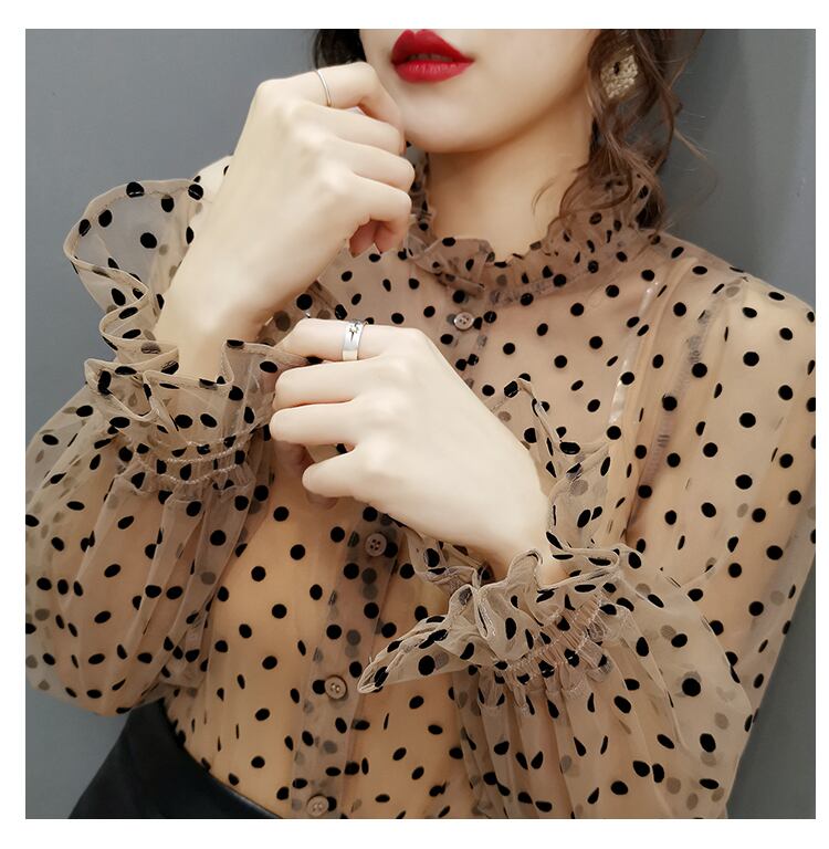 シースルーブラウス ドット柄ブラウス ブラウン ブラック S M L XL トップス ブラウス 袖あり 長袖 ポエットスリーブ ハーフタートルネック 透け感 シースルー かわいい 大人可愛い おしゃれ お洒落 レトロ エキゾチック ラブリー キュート 個性的 モード系 セクシー 存在感 抜け感 柄 ドット柄 水玉 春 夏 秋 冬 オールシーズン シーズンレス ロングシーズン 10代 20代 30代 レディース 女性用 ママ 学生 デート お出かけ 女子会 休日 イベント ランチ ショッピング 着回し