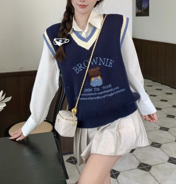 トップス ベスト Vネック ニット かわいい くま カジュアル お洒落 ラブリー キュート ガーリー 通学 デート お出かけ 暖かい ネイビー アイボリー AS10024