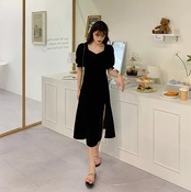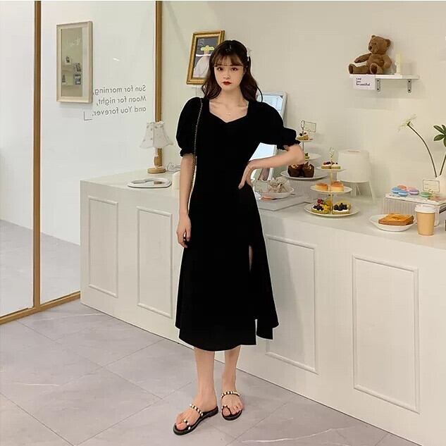 ワンピース ワンピースドレス カジュアルドレス 膝下 ミモレ ミモレ丈 ロング ロング丈 袖あり 5分袖 五分袖 ボリューム袖 襟なし ペンタゴンネック Aライン セミフレア スリット サイドスリット ハイウエスト 華奢 かわいい きれいめ シンプル カジュアル おしゃれ お洒落 レトロ こなれ感 ラフ キュート ルーズ 抜け感 シック クラシック 無地 10代 20代 30代 レディース 女性用 学生 通学 デート お出かけ 休日 イベント M L XL 2XL 3XL 大きいサイズ 黒 ブラック