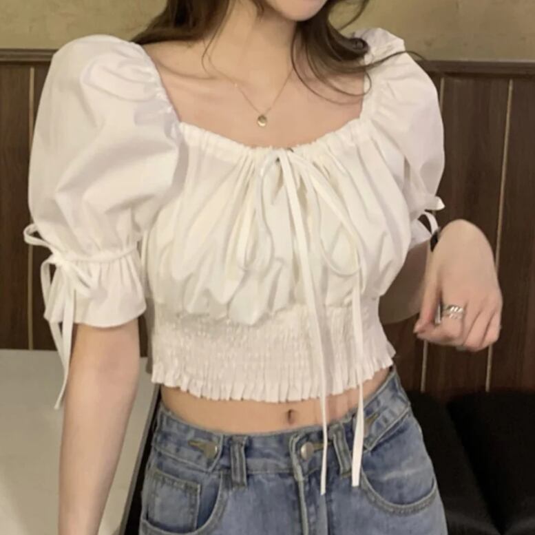 スクエアネック バブルスリーブ トップス ブラウス カットソー 白トップス ショート丈 半袖 かわいい きれいめ おしゃれ 大人可愛い ガーリー 通勤 通学 デート 韓国系 ファッション S M L 白 ホワイト ブルー AS10026