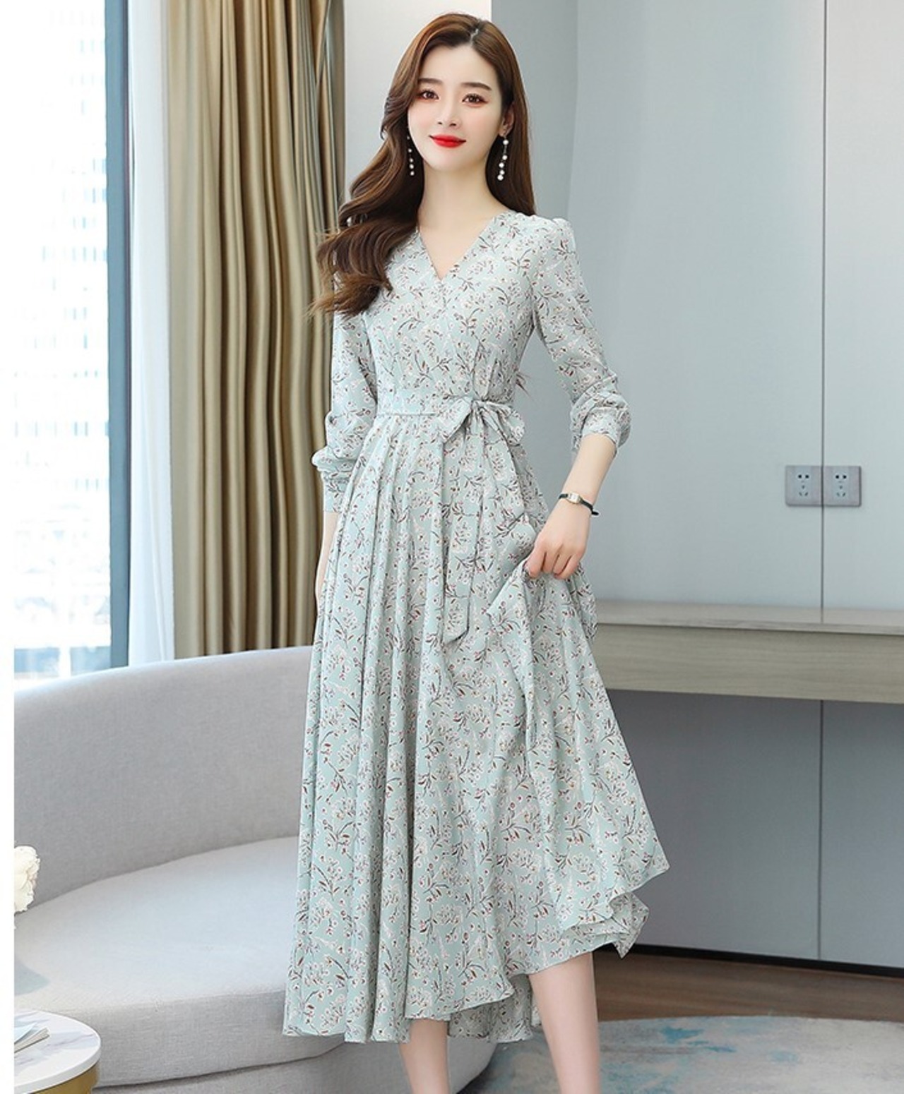 シフォン ドレス スカート ワンピース ロングスカート フレアスカート フレアワンピース ワンピドレス ミモレ ロング 長袖 Vネック フレア Aライン かわいい 大人可愛い きれいめ 上品 おしゃれ エキゾチック 大人女子 ラブリー キュート エレガント 存在感 とろみ感 花柄 リーフ柄 ボタニカル 秋 謝恩会 二次会 20代 30代 デート お出かけ 女子会 パーティー イベント ホテル レストラン 普段使い サイズ S M L XL 2XL 3XL 色展開 ブルー グリーン イエロー アプリコット