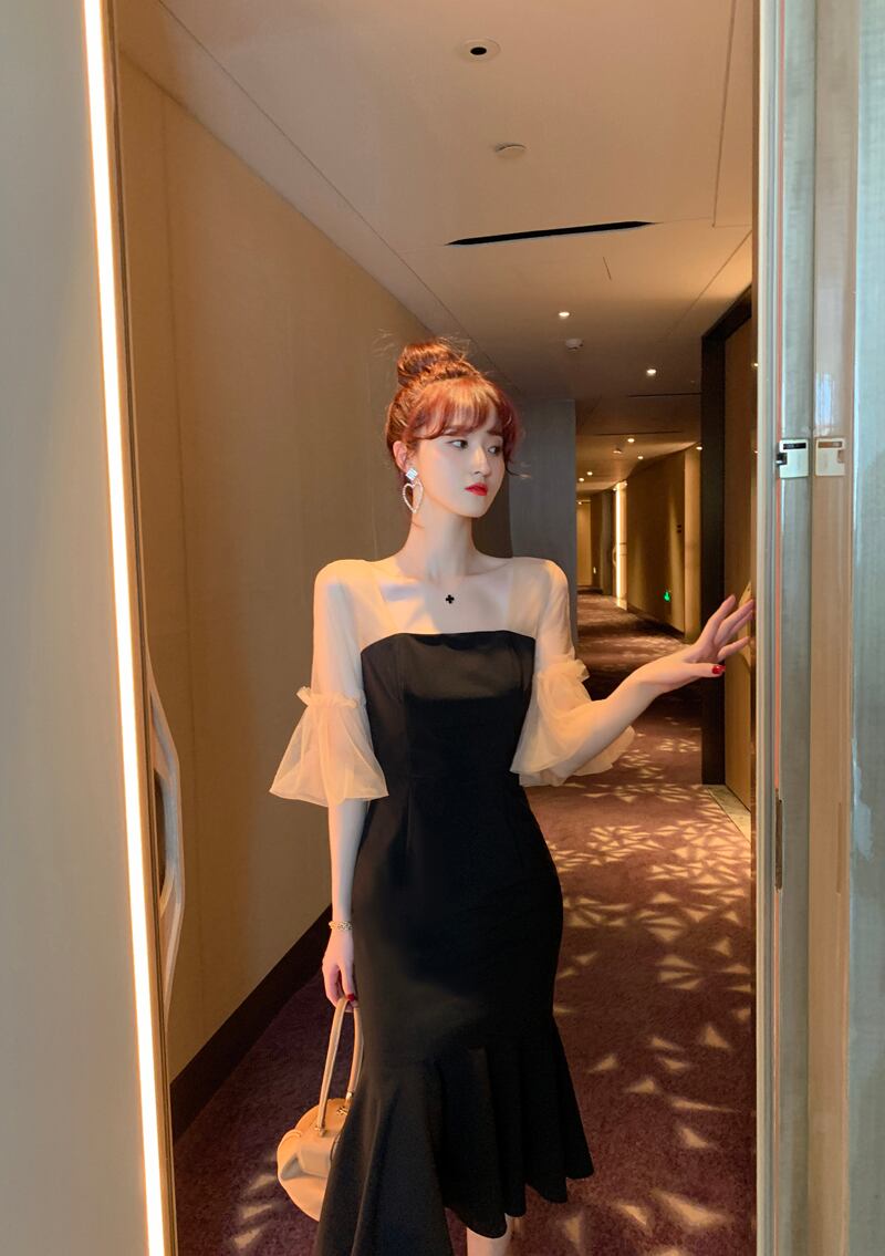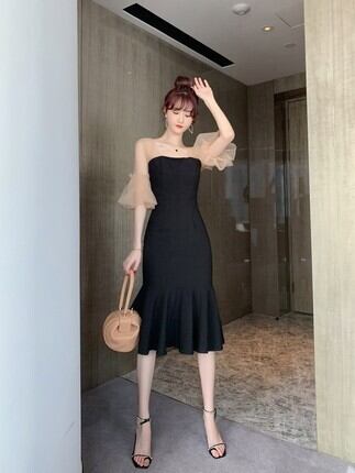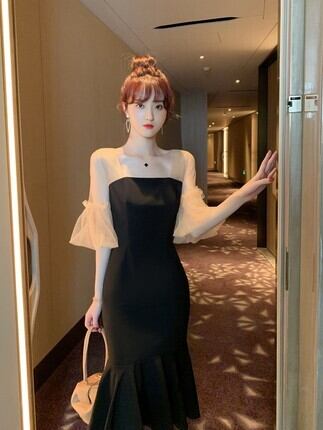マーメイドドレス ブラック ふんわり 膝丈ドレス ドレス パーティードレス 膝丈 ひざ丈 袖あり 5分袖 五分袖 スクエアネック 襟なし マーメイド マーメイドライン ハイウエスト 透け感 シースルー かわいい 大人可愛い きれいめ 大人 上品 おしゃれ お洒落 大人女子 ラブリー キュート セクシー エレガント 存在感 抜け感 華やか 無地 10代 20代 30代 40代 レディース 女性用 デート お出かけ パーティー イベント ホテル レストラン お呼ばれ ランチ 脚長 スタイルアップ 高見え 春
