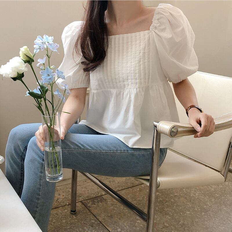 ボリュームのあるパフスリーブとスクエアネックはデコルテをキレイに見せてくれて小顔効果も◎