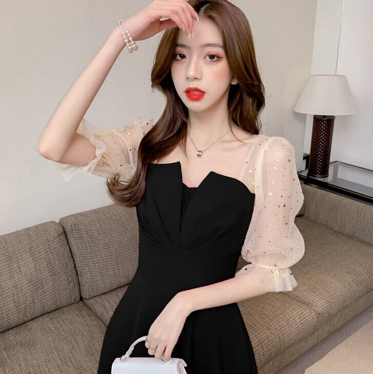 メッシュ生地のパフスリーブがフェアリーで大人可愛いドレス。