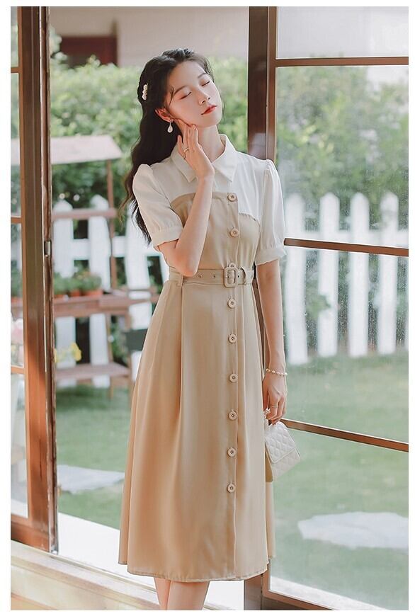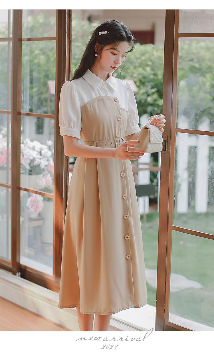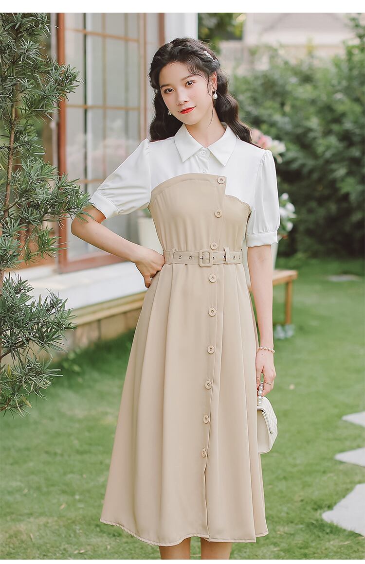 ワンピース 膝下 ミモレ丈 袖あり 半袖 5分袖 五分袖 Vネック 襟付き セミフレア ストレート アシンメトリー 切り替えデザイン ベルト ウエストマーク ハイウエスト かわいい シンプル カジュアル おしゃれ レトロ こなれ感 ラフ メンズライク ルーズ 個性的 クール 存在感 カレッジスタイル フェアリー 無地 10代 20代 レディース 女性用 通勤 学生 通学 デート お出かけ 休日 普段使い お揃い ファッション スタイル 楽ちん 脚長 S M L 黒 ブラック ニュアンスカラー アプリコット