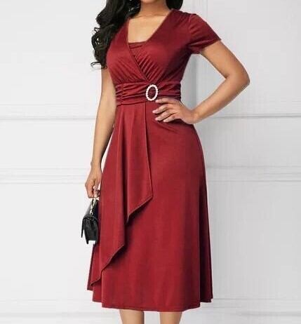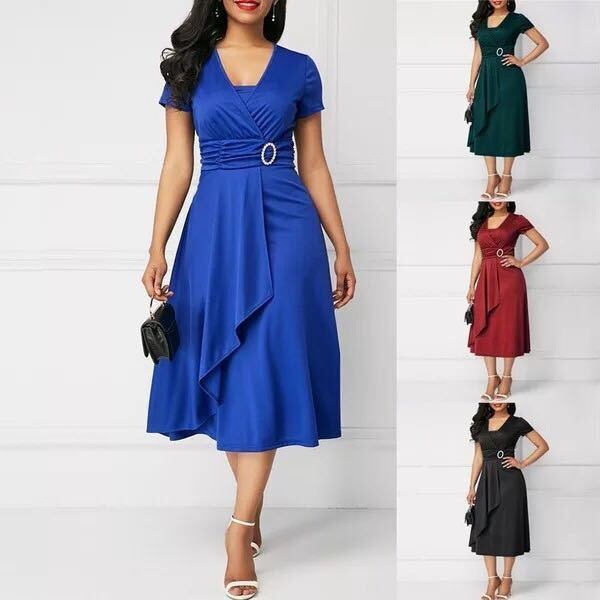 ハイウエストドレス イブニングドレス スカート ワンピース ワンピドレス 膝下 ミモレ ミモレ丈 ロング ロング丈 ミディアム丈 半袖 Vネック Aライン ウエストマーク ハイウエスト かわいい 大人可愛い きれいめ シンプル 上品 おしゃれ お洒落 エキゾチック 大人女子 個性的 モード系 セクシー エレガント 存在感 無地 夏 謝恩会 結婚式 二次会 披露宴 20代 30代 パーティー イベント ホテル サイズ S M L XL 2XL 色展開 ブラック レッド ブルー グリーン ワインレッド 光沢