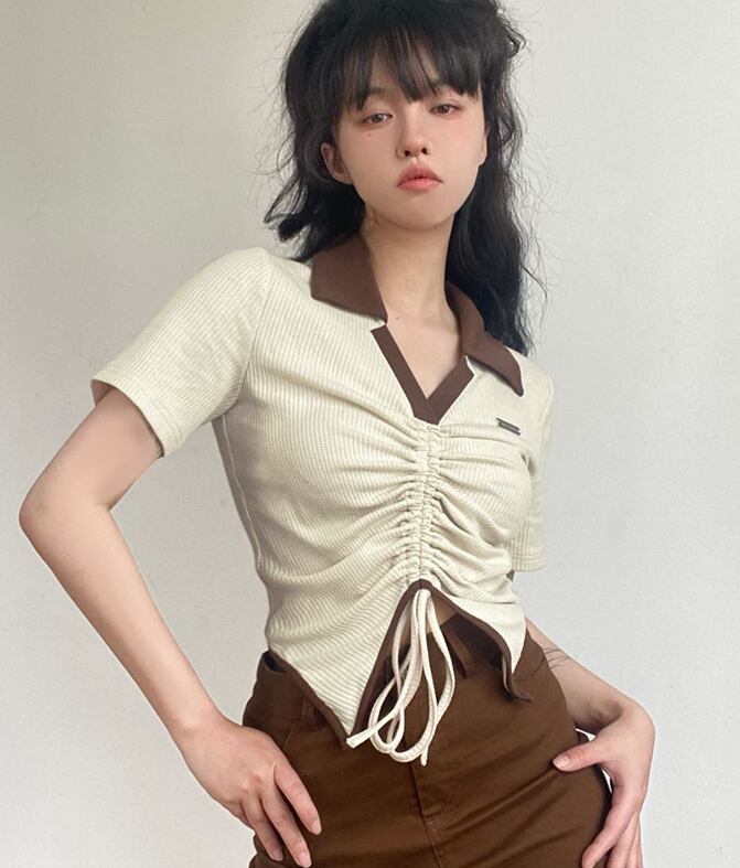 ポロシャツ シャーリング トップス ショート丈 半袖 Vネック かわいい お洒落 ガーリー 個性的 デート お出かけ 韓国系 S M L XL 2XL 黒 ブラック ベージュ AS10027