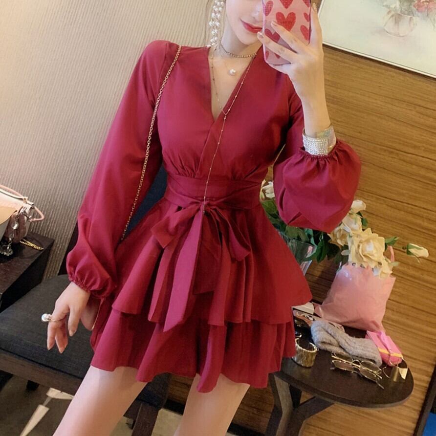キュロット ミニ ドレス パーティードレス パーティドレス 二次会ドレス ミニドレス カジュアルドレス ミニ ミニ丈 超ミニ 長袖 ボリューム袖 パフスリーブ Vネック 切り替えデザイン フレア フリル ウエストマーク ウエストリボン かわいい カジュアル おしゃれ かっこいい こなれ感 ラフ ラブリー キュート 個性的 セクシー 存在感 抜け感 カジュアル 無地 10代 20代 レディース デート パーティー イベント 美脚 脚長 秋 お呼ばれ パーティー サイズ S M L 色展開 赤 レッド