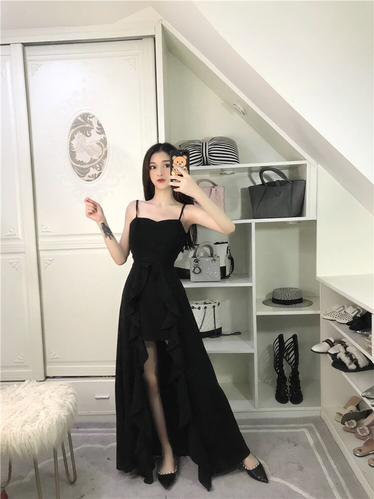 細い肩紐のネックラインと美しく広がるフリルが対照的になっています。