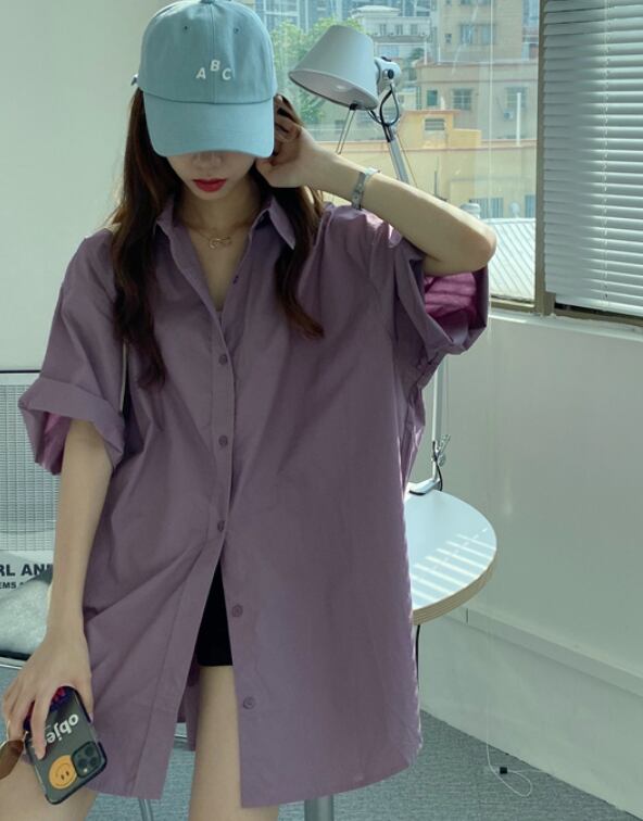 トップス シャツ ロング丈 きれいめ 大人 お洒落 こなれ感 ラフ クール 無地 オールシーズン 通勤 通学 韓国系 ファッション 楽ちん 体系カバー ゆったり ゆる 青 ブルー 紫 パープル AS10038