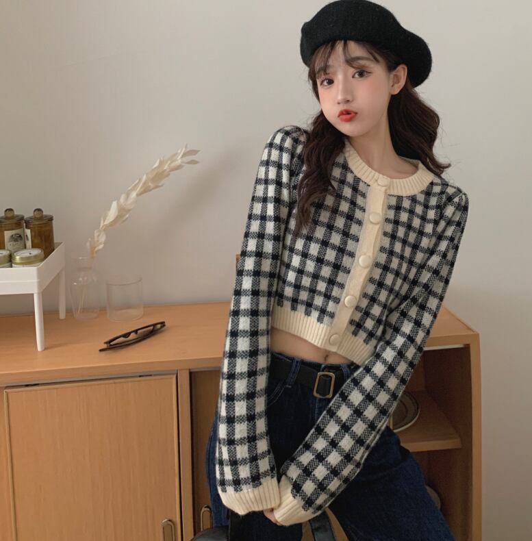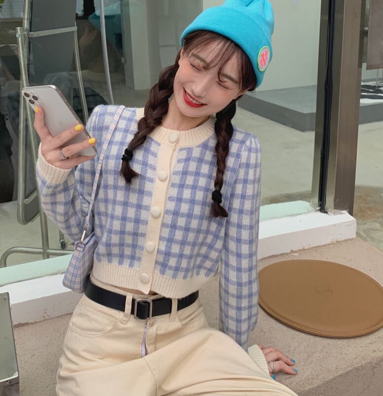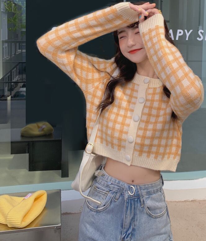 トップス セーター カーディガン ショート丈 長袖 ニット かわいい 上品 おしゃれ お洒落 レトロ 大人可愛い ラブリー キュート ガーリー チェック柄 通勤 通学 デート お出かけ 旅行 韓国系 ファッション 防寒 モテ 黒 ブラック 青 ブルー 黄色 イエロー ピンク AS10039