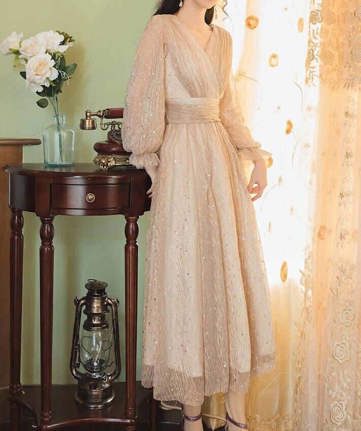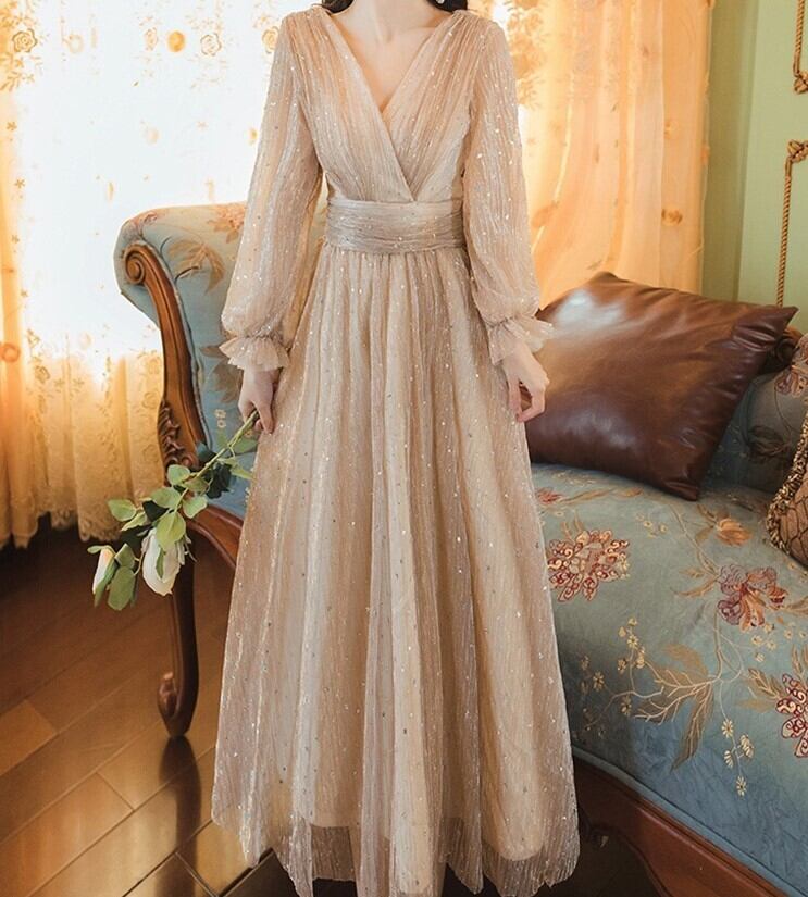 Aライン ロング ドレス パーティードレス 結婚式ドレス ロングドレス Aラインドレス ワンピースドレス ロング マキシ マキシ丈 長袖 パフスリーブ ランタンスリーブ Vネック カシュクール Aライン フレア シフォン ウエストマーク 透け感 かわいい 大人可愛い 大人 上品 おしゃれ レトロ ラブリー キュート 個性的 エレガント ゴージャス 華やか お姫様 お嬢様 無地 10代 20代 パーティー イベント 春 秋 ウェディング 結婚式 二次会 お呼ばれ ブライズメイド サイズ S M ゴールド