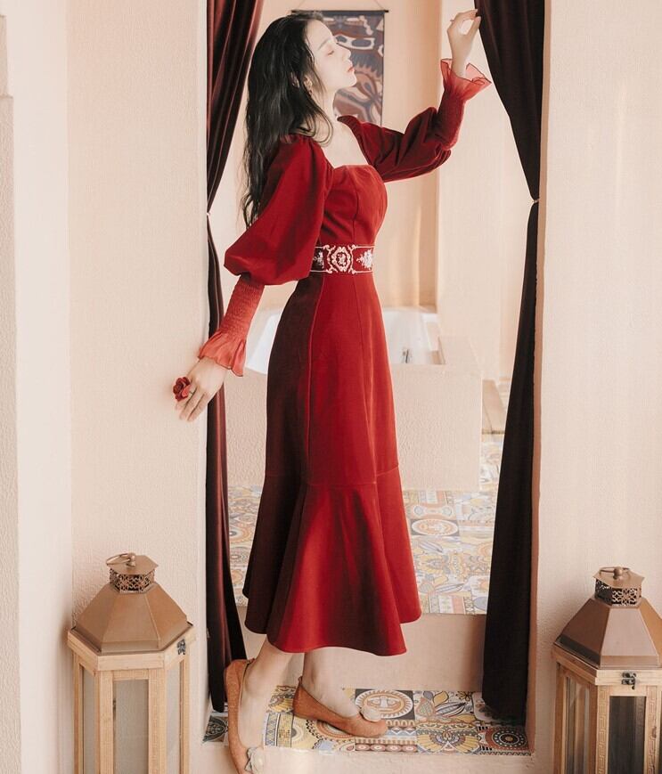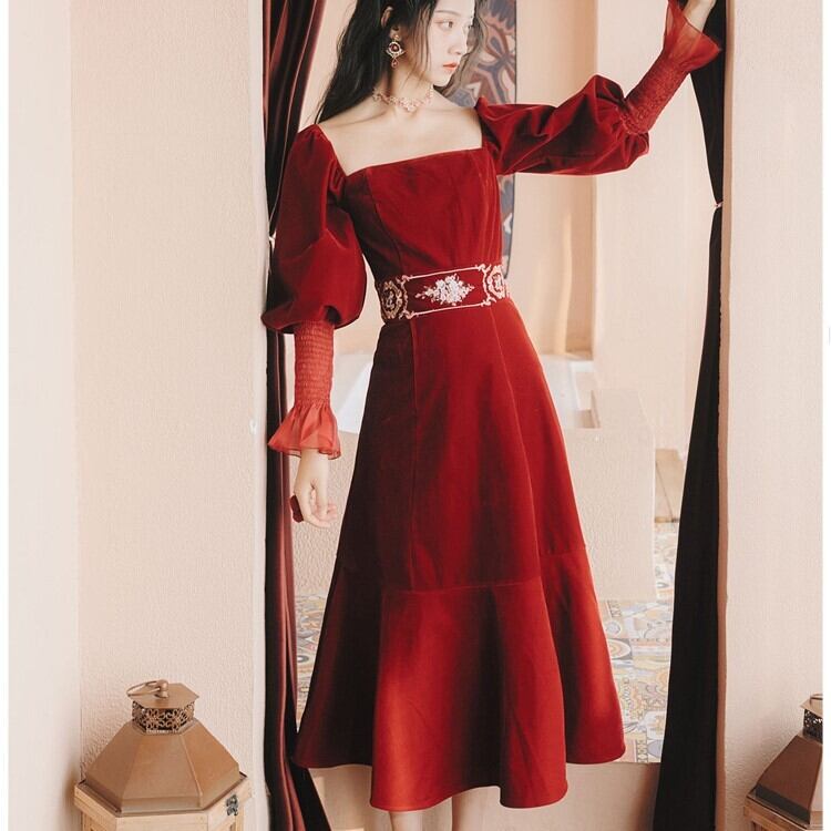個性的 ドレス ワンピース パーティードレス 二次会ドレス ロングドレス ステージドレス 舞台衣装 Aラインドレス ロング 長袖 ボリューム袖 ランタンスリーブ スクエアネック Aライン ウエストマーク かわいい 大人可愛い 上品 おしゃれ かっこいい レトロ エスニック こなれ感 ラブリー キュート 存在感 クラシック 無地 10代 20代 パーティー イベント 高見え 格上げ 秋 二次会 2次会 1.5次会 お呼ばれ 演奏会 発表会 ピアノ サイズ S M L 色展開 赤 レッド ワインレッド