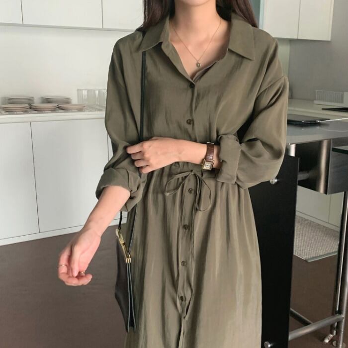 シャツ ワンピース ロングスカート シャツワンピース ロング ロング丈 長袖 襟付き ストレート Iライン ウエストマーク ウエストリボン サイドスリット かわいい 大人可愛い きれいめ シンプル カジュアル 大人 おしゃれ かっこいい 大人女子 こなれ感 ラフ ルーズ 個性的 モード系 抜け感 無地 春 秋 10代 20代 30代 40代 レディース OL 通勤 学生 通学 デート お出かけ 公園デビュー 休日 着回し 普段使い 楽ちん サイズ S M L XL 色展開 緑 グリーン 大人カラー