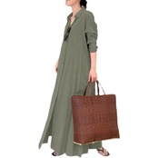 ゆったりシルエットで体型を拾わないマキシ丈シャツワンピース。