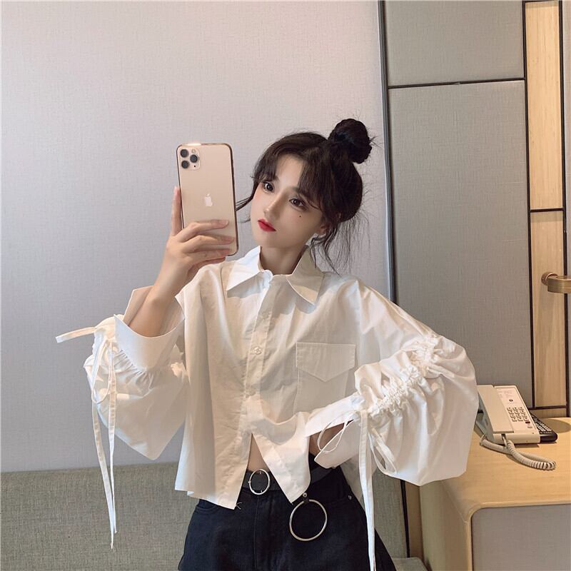 トップス Tシャツ シャツ ブラウス 白シャツ 白トップス ショート ショート丈 袖あり 長袖 パフスリーブ Vネック 襟付き ワイド Iライン スマート フリル リボン 前開き かわいい 大人可愛い カジュアル 大人 上品 おしゃれ お洒落 大人可愛い 大人女子 こなれ感 ラブリー キュート ガーリー 個性的 モード系 エレガント 主役級 存在感 無地 秋 冬 20代 30代 40代 レディース 女性用 ママ OL 学生 通学 デート 女子会 イベント リゾート 旅行