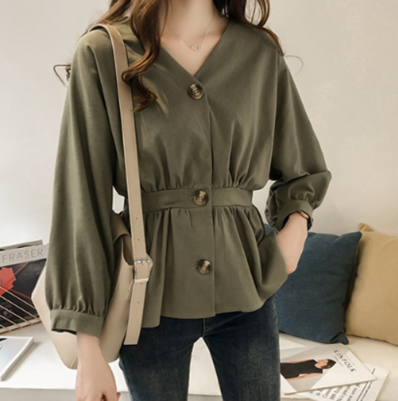 大きいボタンがワンポイントのオーバーサイスのシャツ。