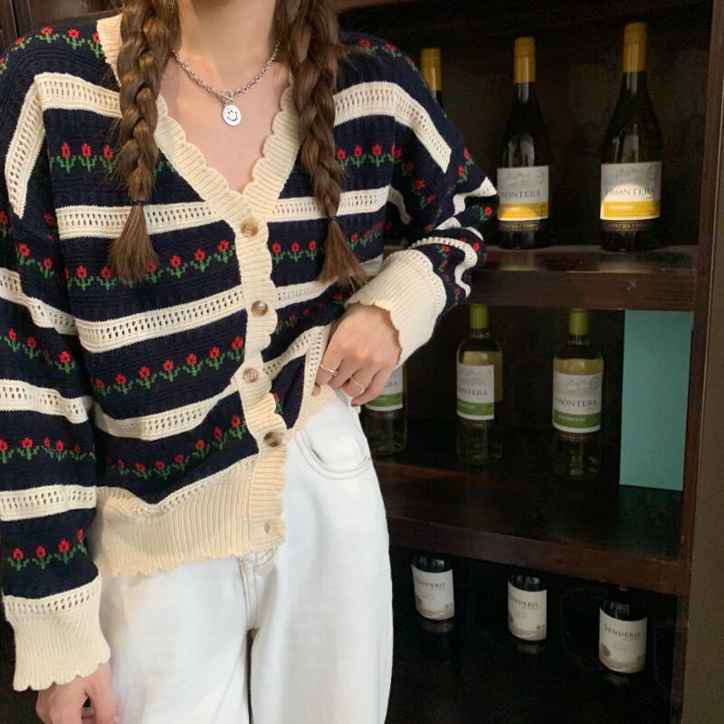 チェーンフラワー トップス カーディガン 長袖 お洒落 レトロ 大人可愛い ラブリー キュート ガーリー 花柄 小花柄 通勤 通学 お出かけ 旅行 着回し 韓国系 ファッション 暖かい 防寒 黒 ブラック AS10052