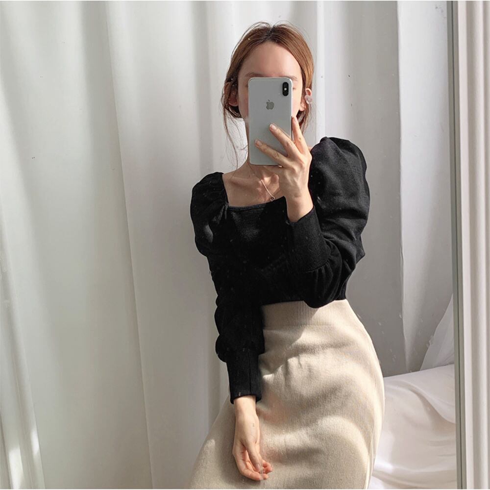 トップス ニットソー 袖あり 長袖 ボリューム袖 スクエアネック スリム タイト 細身 ニット かわいい 大人可愛い きれいめ シンプル カジュアル 大人 上品 おしゃれ お洒落 レトロ 大人女子 こなれ感 ルーズ 個性的 クール モード系 エレガント とろみ感 抜け感 無地 秋 冬 誕生日 バレンタイン 10代 20代 30代 レディース オフィス ビジネス OL デート お出かけ 女子会 休日 レストラン 韓国 韓国系 オルチャン ファッション コーデ スタイル 楽ちん モテ 定番 トレンド 流行