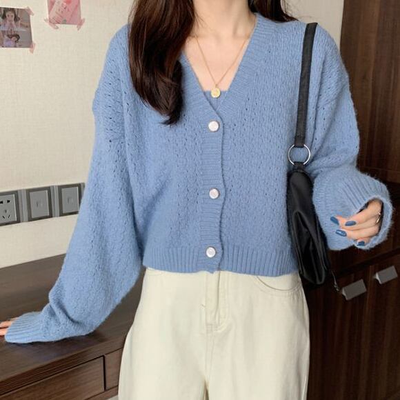 ショート丈のニットキャミと、きれいめボタンがアクセントのカーディガン。