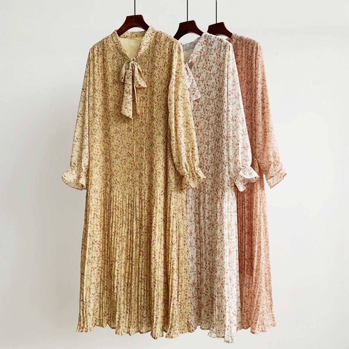プリーツロングスカート 花柄ワンピース シフォンロングスカート スカート ワンピース プルオーバー ロングスカート プリーツスカート フレアスカート 膝下 ロング ロング丈 7分丈 ミディアム丈 袖あり パフスリーブ ドロップショルダー Vネック 襟付き スリム Aライン スマート プリーツ シフォン フリル リボン ハイウエスト かわいい 大人可愛い カジュアル 大人 上品 おしゃれ お洒落 レトロ キュート ガーリー 柄 花柄 小花柄 フラワー 春 秋 20代 30代