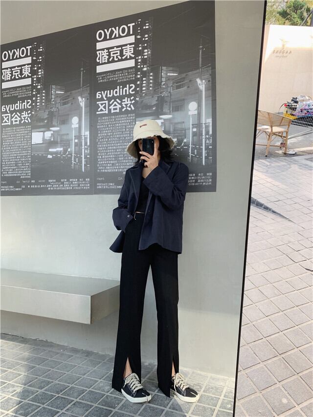 前の裾部分の深めのスリットがポイントのストレートパンツ。