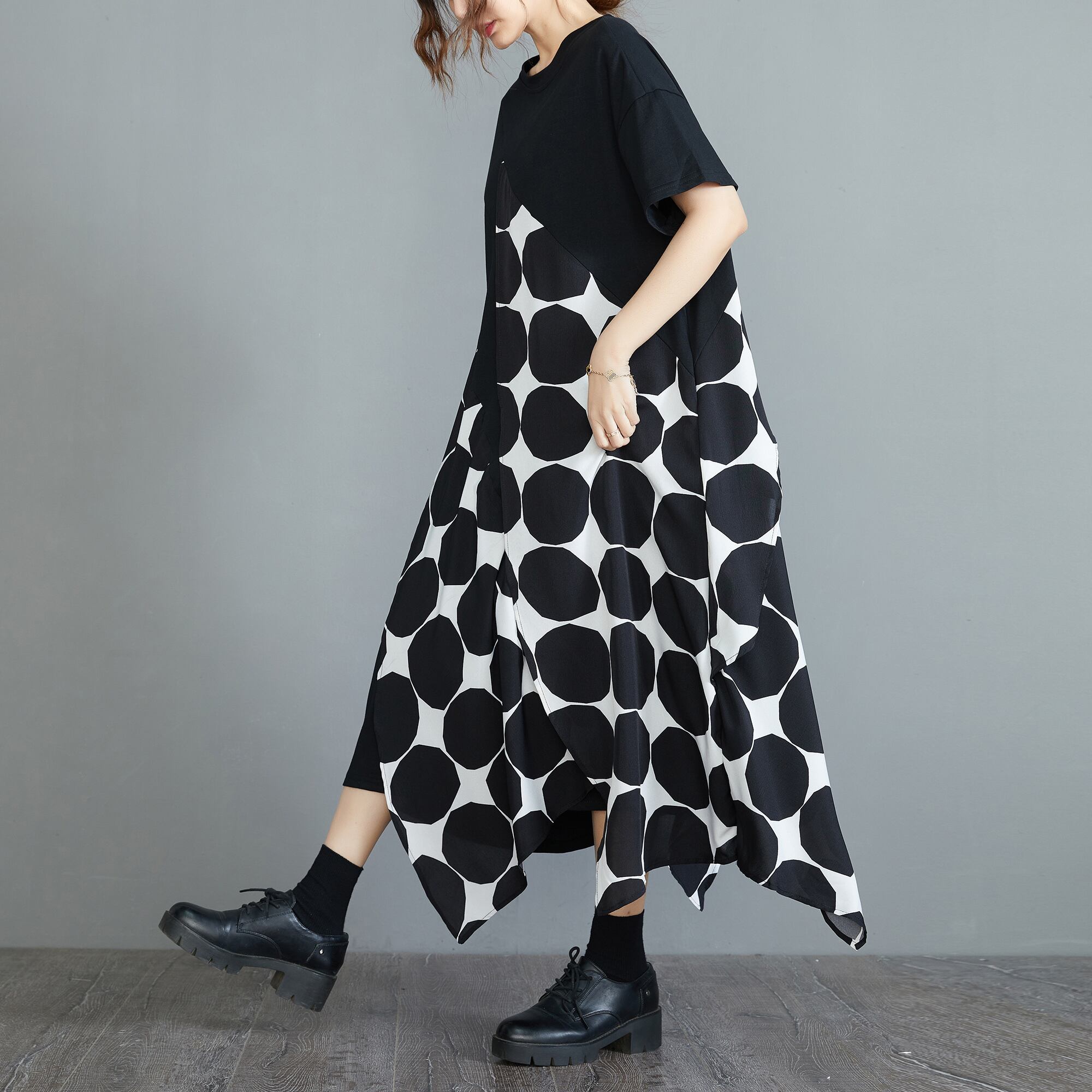 レトロ柄ワンピース アシンメトリーワンピース 大きいサイズ ワンピース ロングワンピース 膝下 ロング ロング丈 袖あり 半袖 ラウンドネック 襟なし ワイド ビッグシルエット オーバーサイズ かわいい おしゃれ お洒落 レトロ ラフ ガーリー 個性的 存在感 柄 ドット柄 水玉 春 夏 秋 ロングシーズン 10代 20代 30代 40代 50代 レディース 女性用 ママ マタニティ マタニティワンピース 学生 デート お出かけ 女子会 休日 旅行 お茶会 ランチ ショッピング 着回し 普段使い