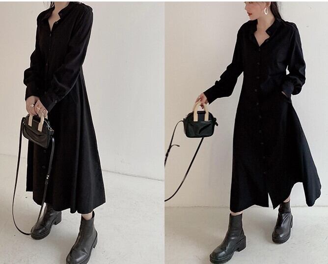 ブラックドレス ワンピース ロングスカート フレアスカート シャツワンピース フレアワンピース ロング ロング丈 長袖 Vネック Aライン ポケット ハイウエスト 前開き かわいい 大人可愛い きれいめ シンプル カジュアル 大人 上品 おしゃれ かっこいい レトロ エスニック 大人女子 こなれ感 ラフ モード系 モダン 抜け感 無地 秋 冬 10代 20代 30代 レディース ママ 通勤 学生 通学 デート お出かけ 女子会 休日 イベント 着回し 普段使い 体系カバー サイズ S 色展開 黒 ブラック